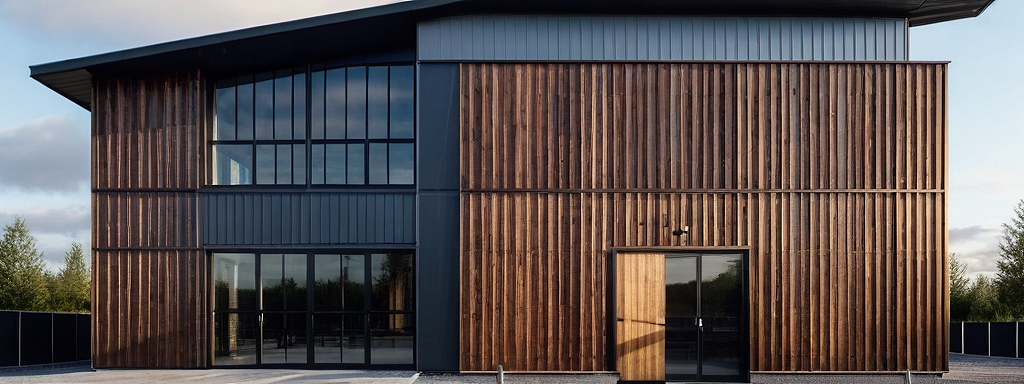 PromptBio Climatic Warehouse Metal Structure Timber Cladding Lanscaping Day Mood