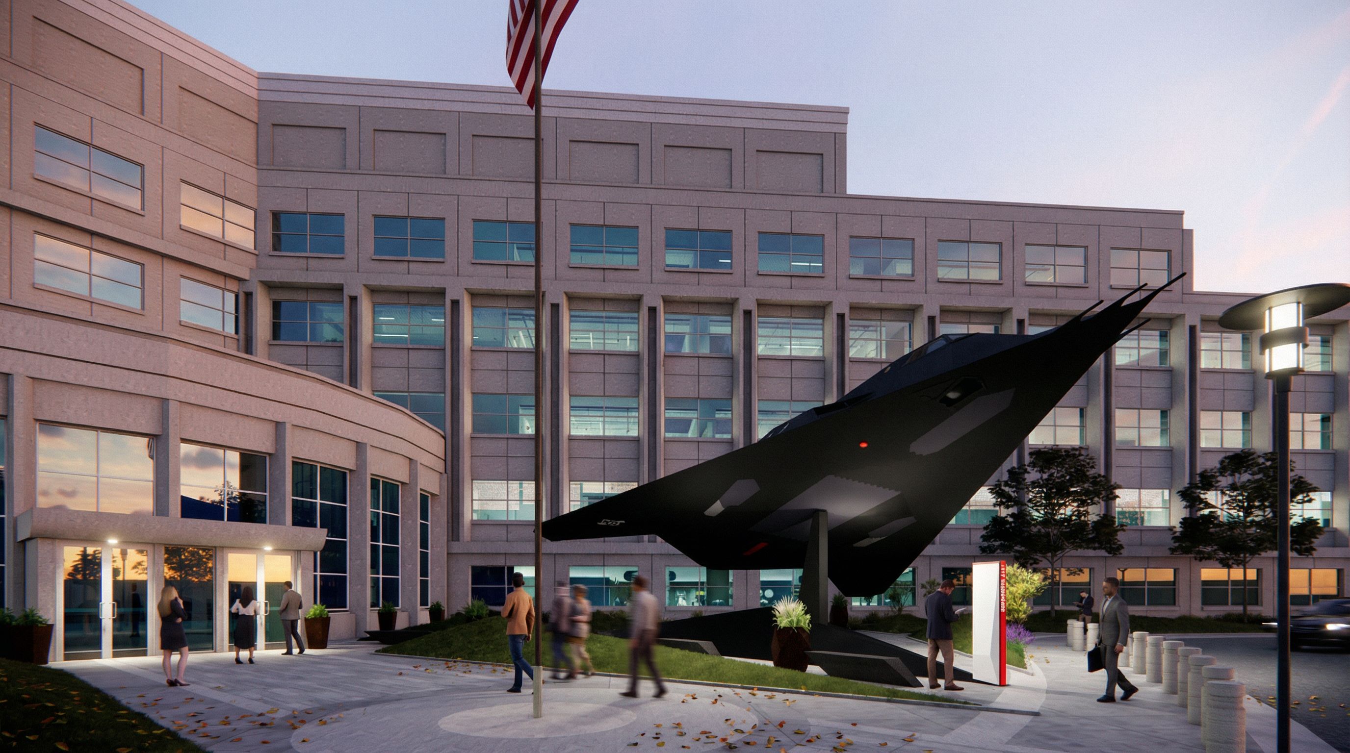PromptPhoto of a modern commercial building featuring a sleek, curved entrance with a large black sculpture in the foreground. Architectural details include large glass windows reflecting the surroundings and a textured concrete façade. Located in an urban setting with city life bustling around, the scene is illuminated by soft, evening light casting shadows on the entrance pathway. Captured from a low angle to highlight the sculpture and building, a 35mm lens capturing the essence of movement with people engaged in conversation and walking toward the entrance., keep exact camera angle