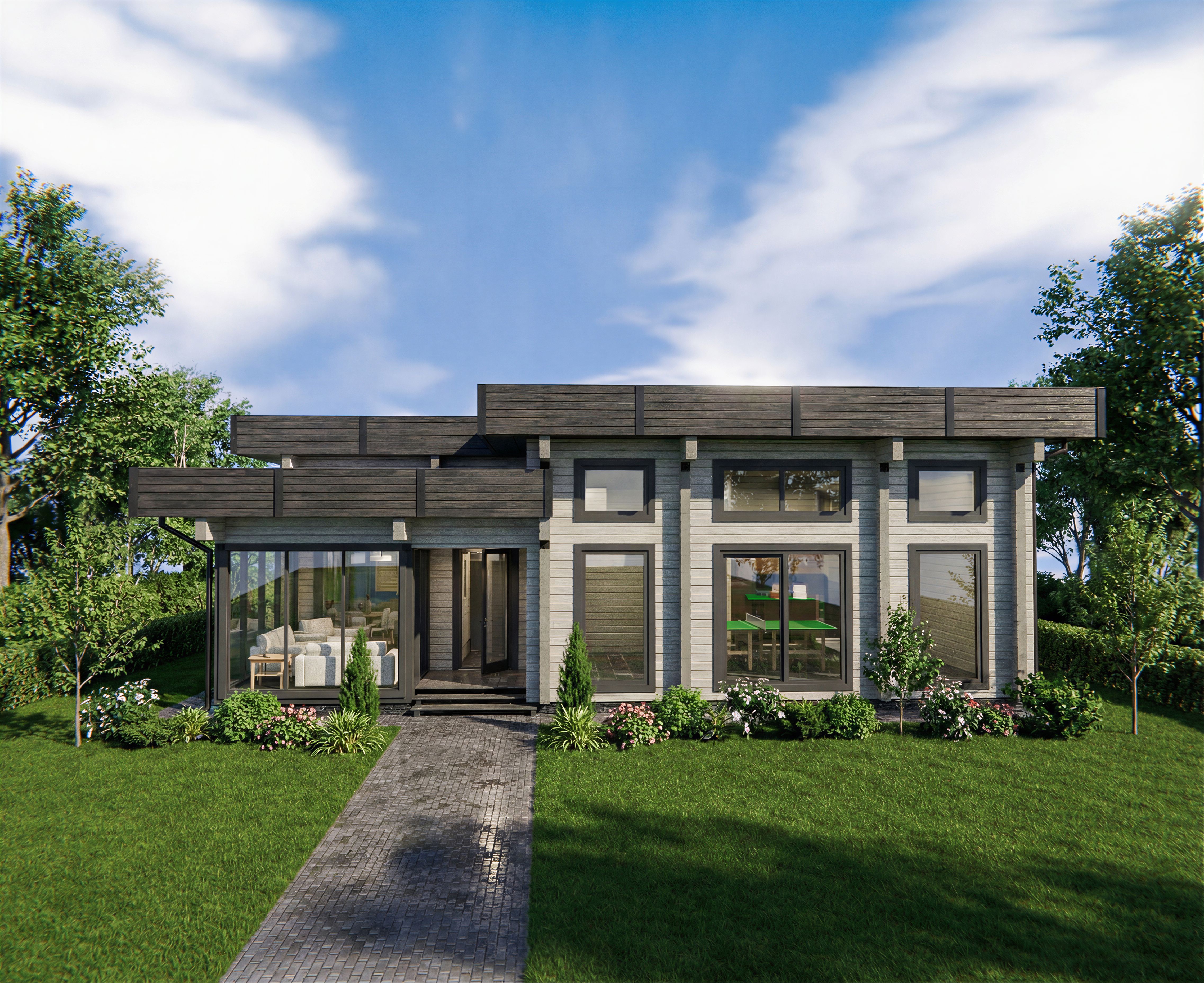 architectural visualization of a private house made of gray glued laminated timber with contrasting ends on a human scale, keep exact camera angle