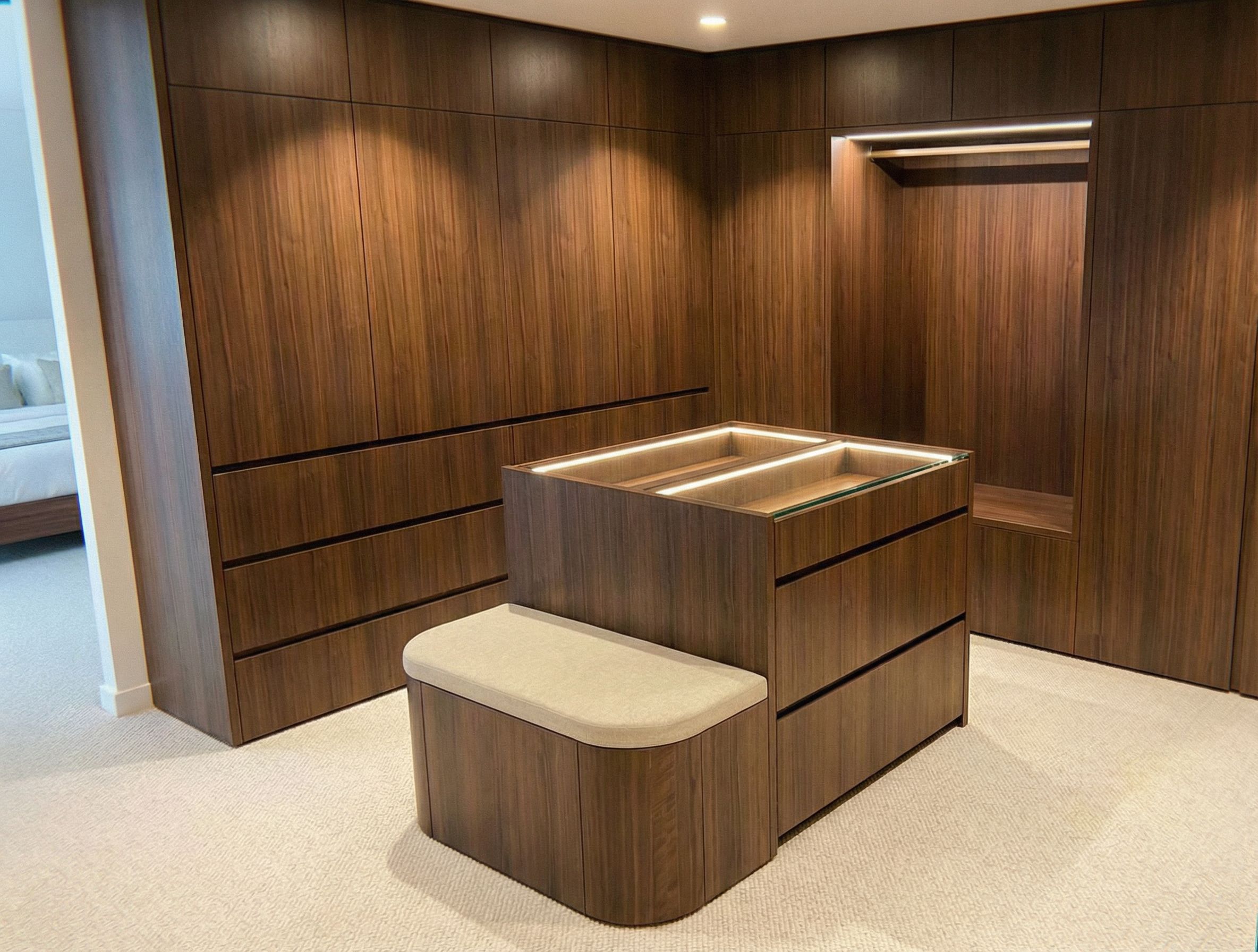 PromptRemove clothing on seat. Add a glass top to the island with led strip lighting, keep exact camera angle