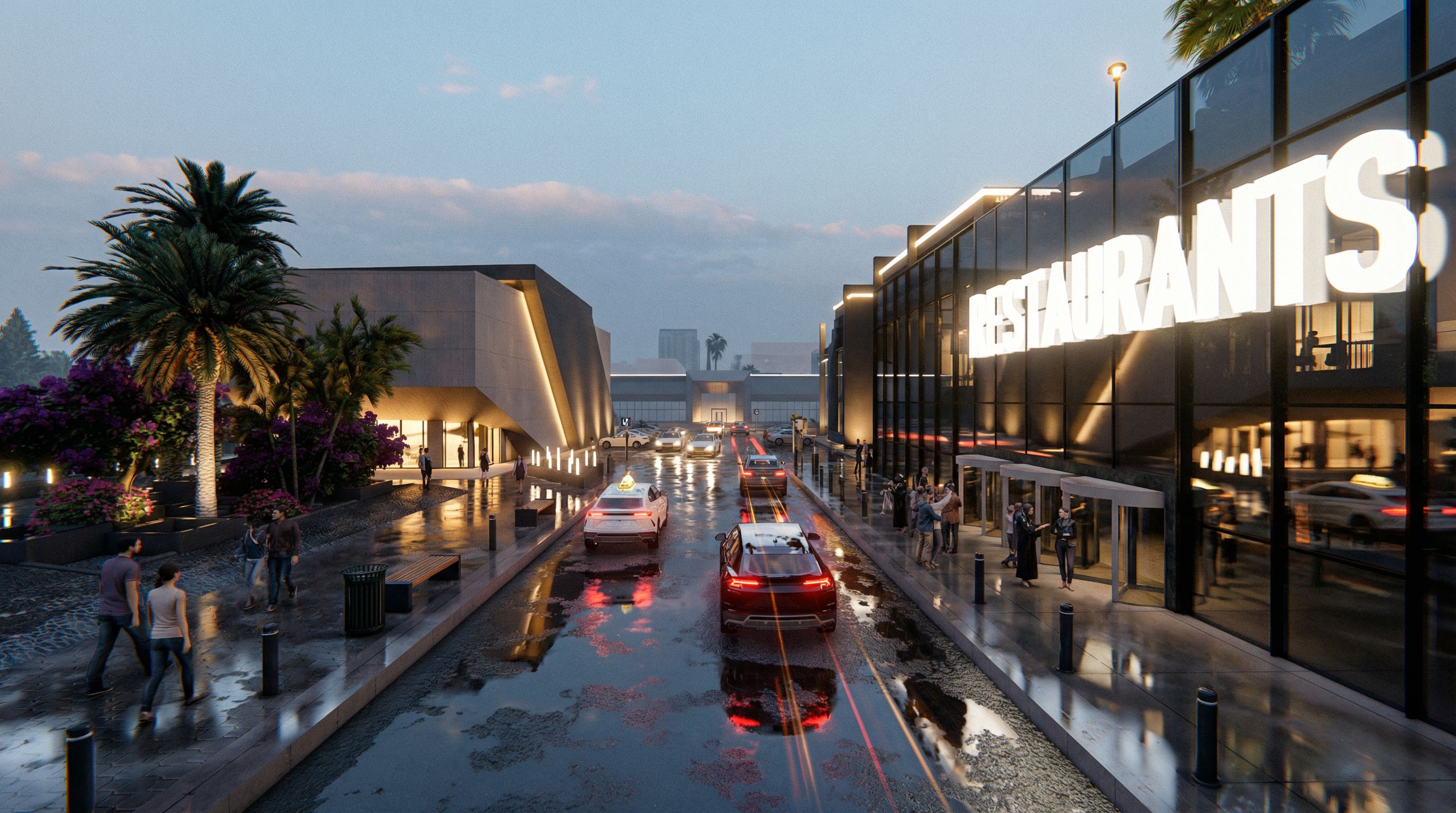 Promptthis a scene of a street between of a theatre in the left and a restaurants on the right zone make things alive and real , keep exact camera angle