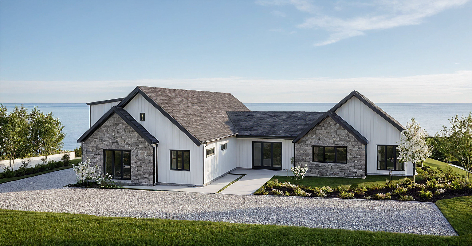 PromptAdd landscaping, grass, flowers, driveway area as shown, white vertical siding, modern stone in the gables as shown