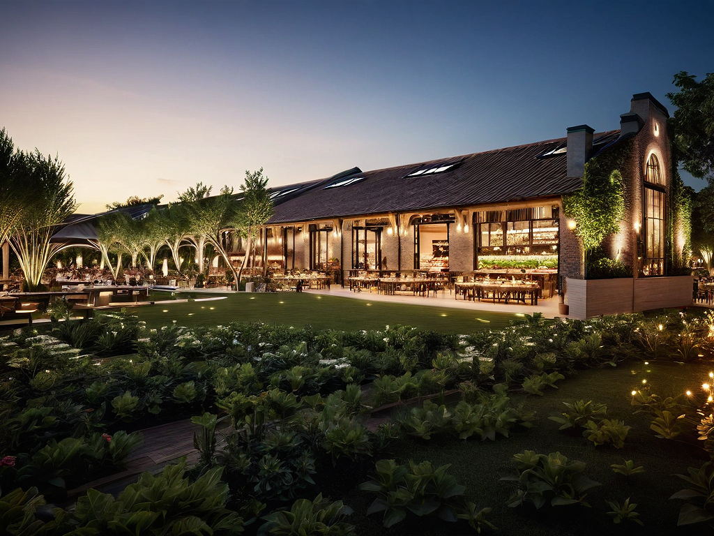 food hall, amazing garden, same construction materials, same facade, amazing terrace, sunset