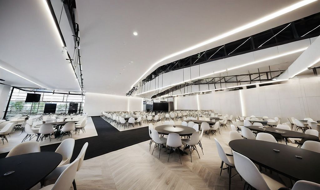 modern architecture, gallery, event space, modern chairs, linear lights, focused lighting, black and white ceilings, photorealistic