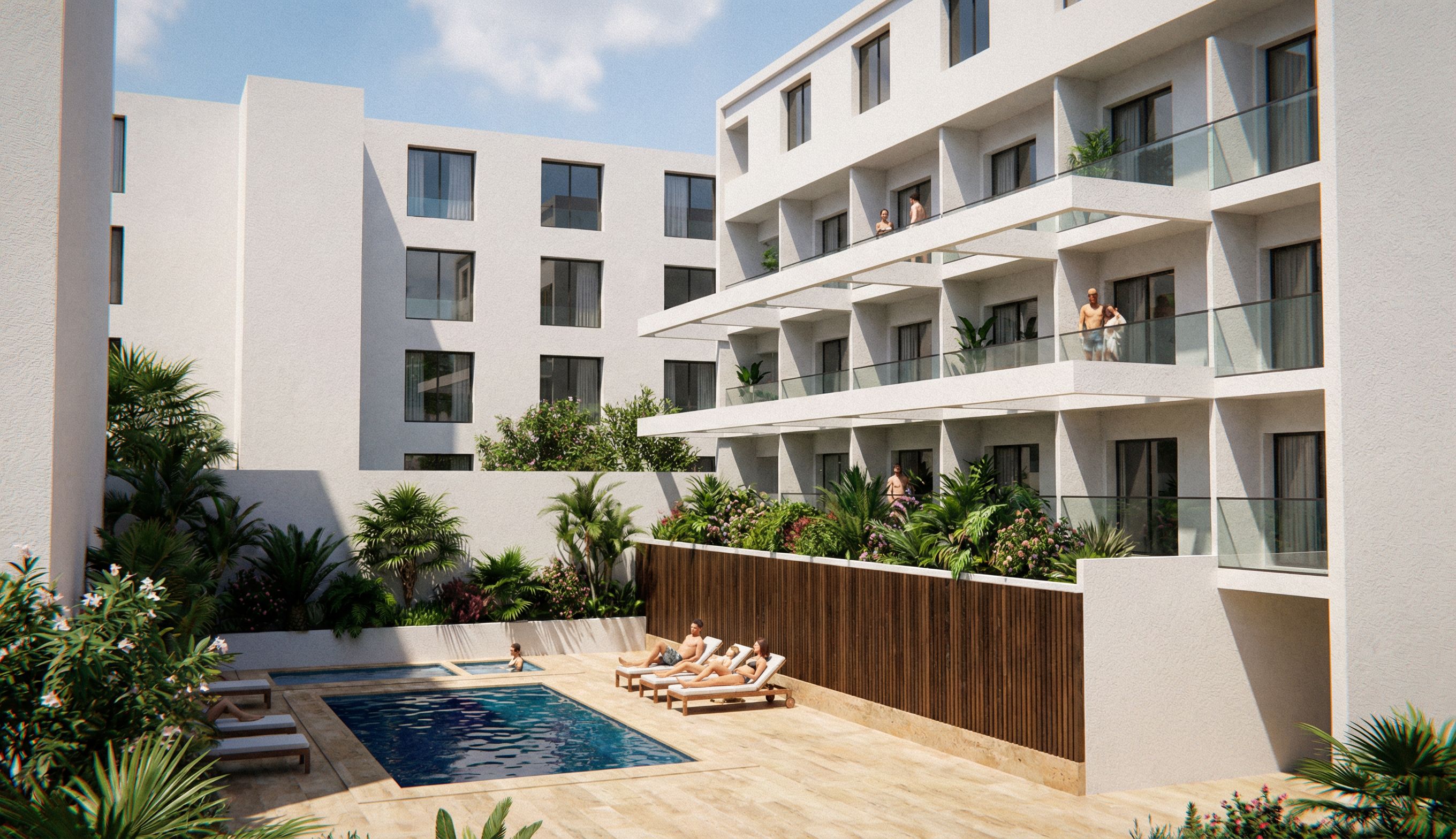 Promptgenera un render realista moderno, RESPETA LA VOLUMETRIA, el volumen blanco, los suelos de travertino y la piscina un color azul profundo, , keep exact camera angle, keep exact camera angle