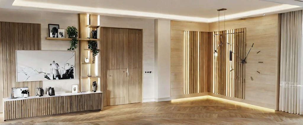 realistic render with shadow and lights dynamics. Floor very light parquet planks. Wall panels with slats in white oak veneer, with back led stripe as ambience light warm. Shelves and furniture in ash wood veneer. Walls behind wall panels and clock - light beige. Right corner wall panel behind slats in white marble. In the hanged ceiling led stripe inside the cut. Hanging light make on. Door dark brown.