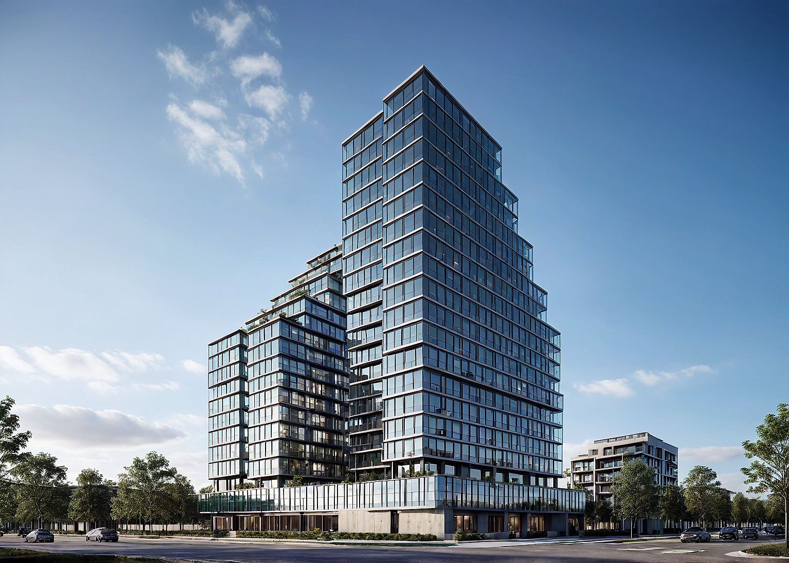 PromptUltra-realistic rendering of a modern residential high-rise tower. The façade is not a full curtain wall, but a mix of glass and solid walls. Large windows and balconies alternate with solid concrete and textured wall panels, arranged in a random but harmonious pattern across the façade. The design emphasizes residential scale: vertical and horizontal divisions, rhythm, and variety. Balconies with glass or metal railings are integrated for each unit. Materials include concrete, stone panels, and glass, with a balance between transparency and opacity. Contemporary style, photorealistic rendering, urban context.