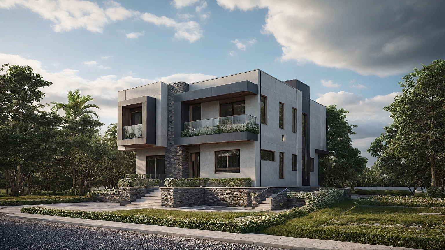 PromptDetailed photo of a modern villa, daylight mood, stone facade, add relevant vegetation and flowers, add people where necessary, dramatic clouds