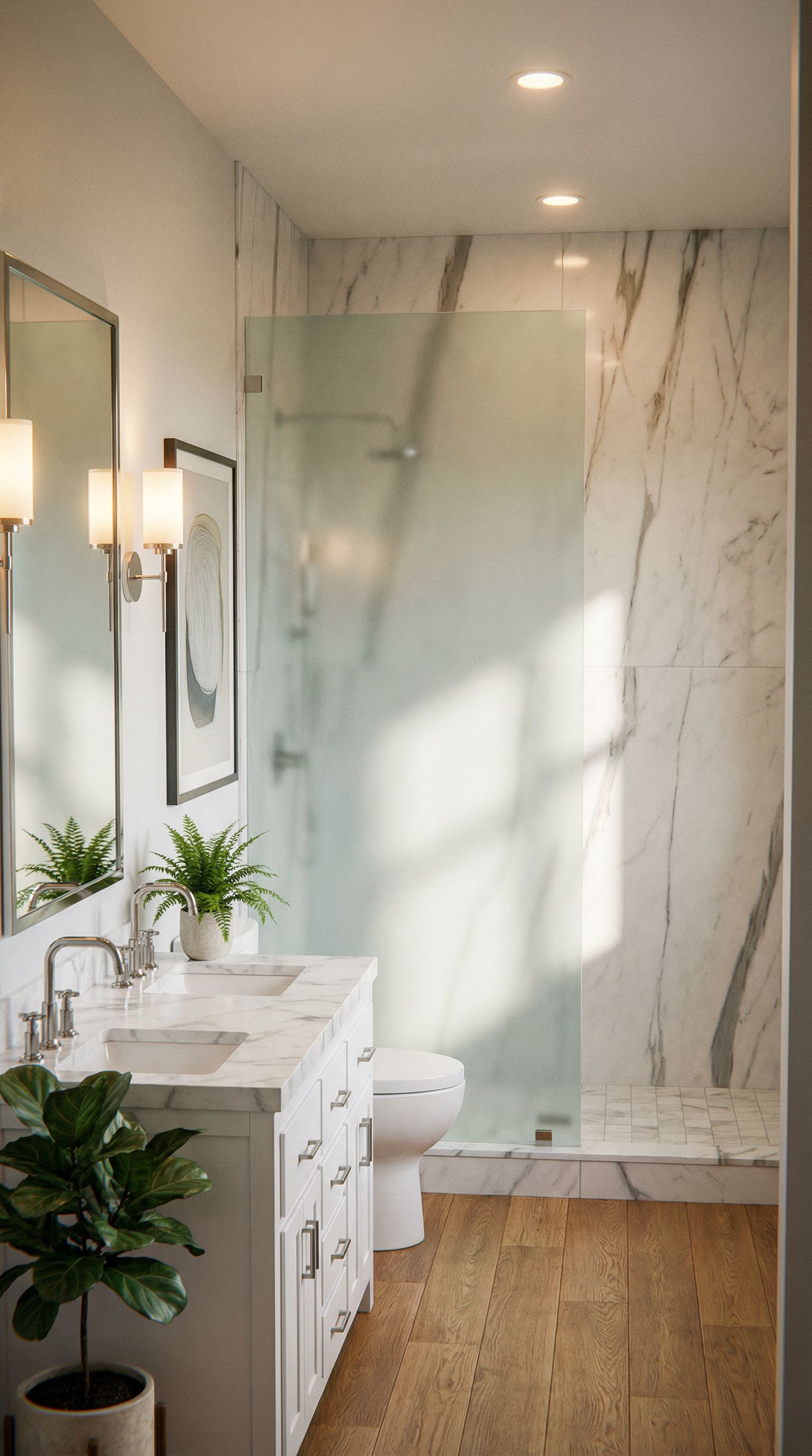 Photo of a contemporary bathroom featuring sleek design elements such as a double vanity with modern faucets and a minimalist toilet. Elegant marble walls contrast with warm wood flooring, enhancing the space's luxury. The frameless glass shower door presents a seamless transition, reflecting light beautifully. Ambient natural light filters through the translucent shower panel, creating soft shadows and highlights. Captured from a corner perspective, the framing emphasizes the spaciousness, with a wide-angle lens enhancing the overall immersiveness of the scene. add a shower curb, tile walls and floor, keep exact camera angle