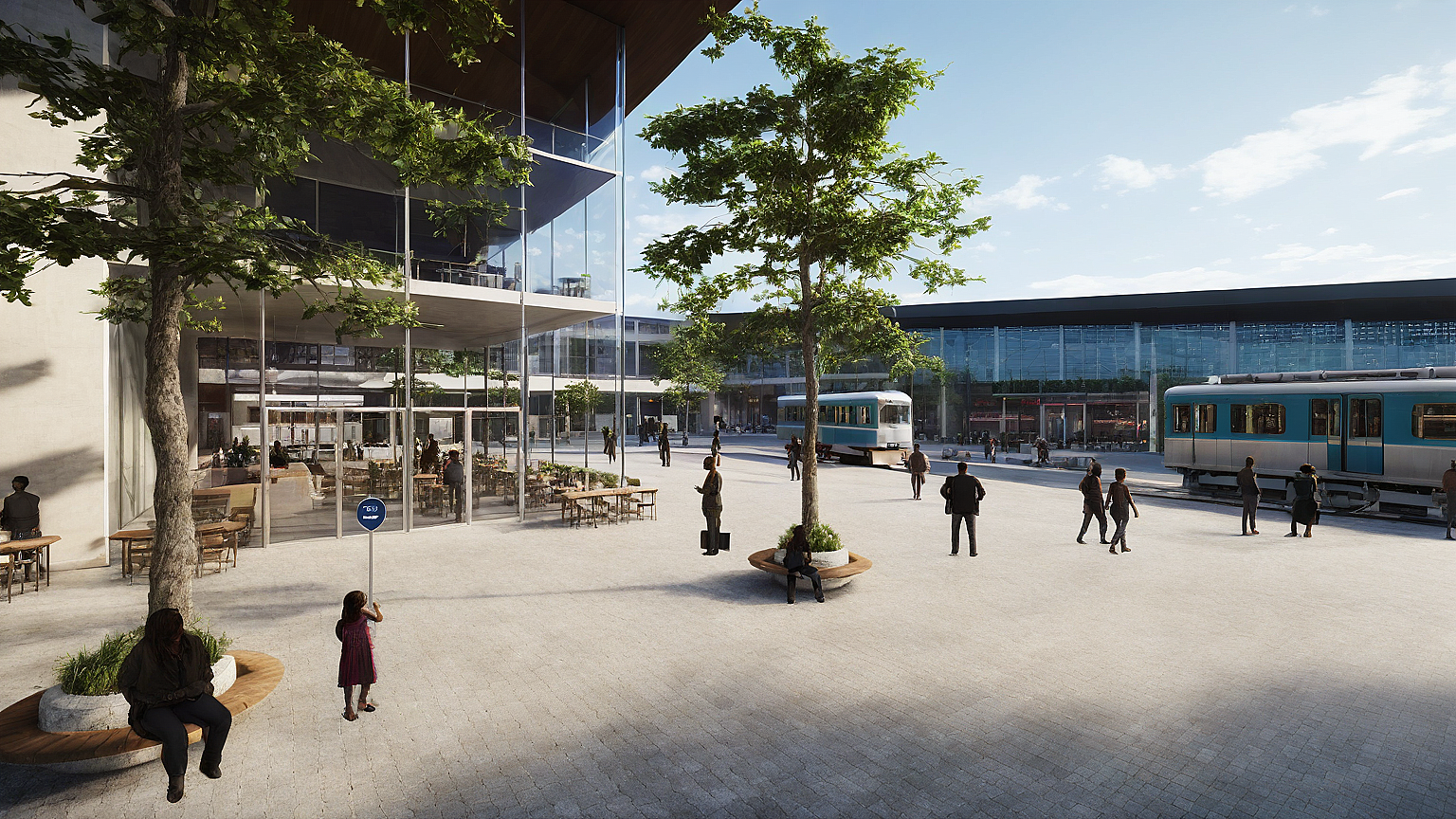 daytime social district proposal without altering the design. Turn on indoor lights for warmth. Add realistic vegetation and people where appropriate. Emphasize the materials—glass, concrete, and plaster—with accurate textures and reflections. Improve lighting, shadows, and overall atmosphere for a vivid, lively, and cohesive look. This area has cafes and restaurants. Add people sitting in the chairs. signage and the train carts are kiosks. Keep all straight lines straight