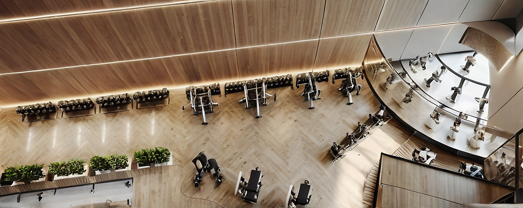 PromptIT IS A GYM, THE LONG WALLS ARE MIRRORED, LED LIGHT APPLICATIONS, MODERN, MINIMALIST AND WITH LIGHT COLORS