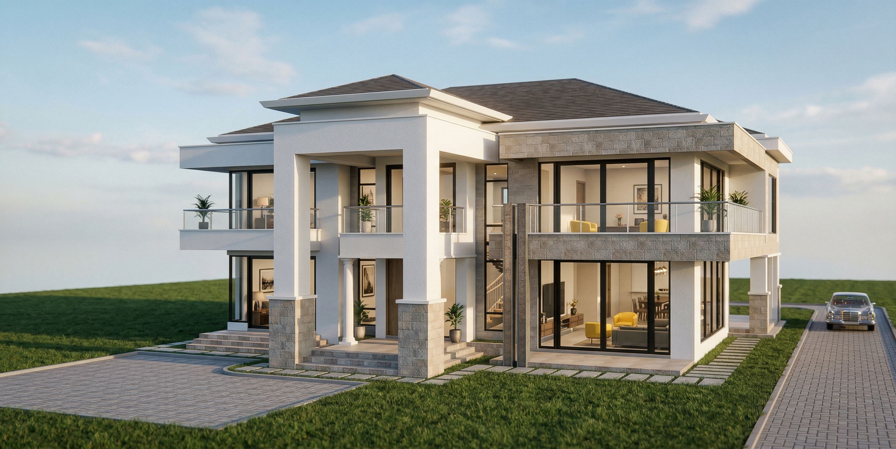 PromptPhoto of a modern residential building featuring expansive glass walls and elegant stone detailing. The design incorporates sleek columns and a prominent roofline. Surrounding the structure is a lush green lawn with a carefully paved driveway. The scene is illuminated by soft afternoon sunlight, casting gentle shadows across the facade. A low-angle perspective highlights the building's striking features, while a wide-angle view captures the impressive scale and surrounding environment, emphasizing the harmonious balance between nature and architecture., keep exact camera angle