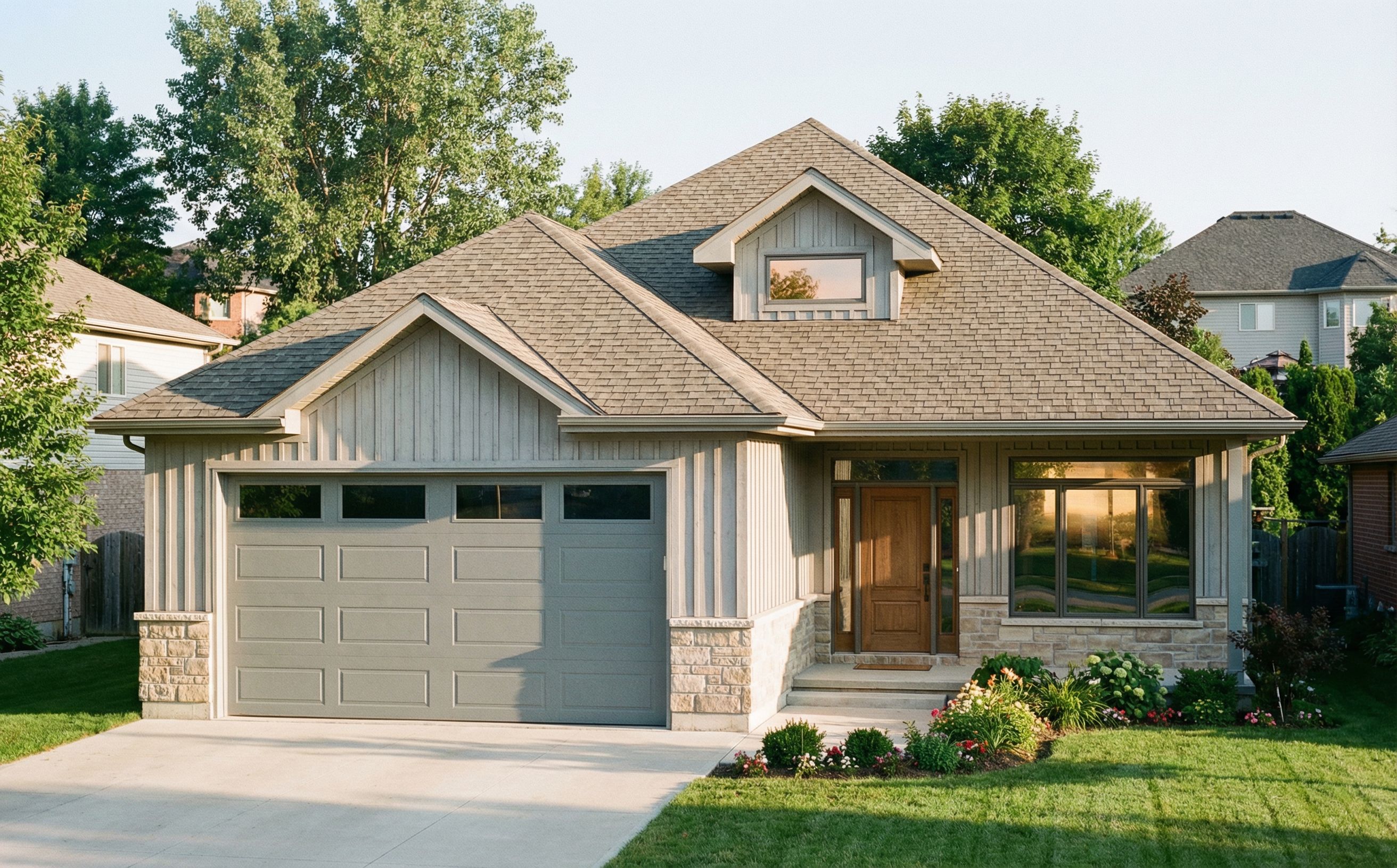 PromptPhoto of a contemporary single-family home featuring a gabled roof, large front windows, and a spacious garage. Highlight the vertical siding and stone skirts. The setting is a residential neighborhood with manicured lawns and neighboring houses in a suburban context. Soft morning light creates gentle shadows, enhancing the architectural details. Capture the scene from a frontal perspective, using a wide-angle lens to emphasize depth and scale, providing a welcoming and vibrant atmosphere., keep exact camera angle