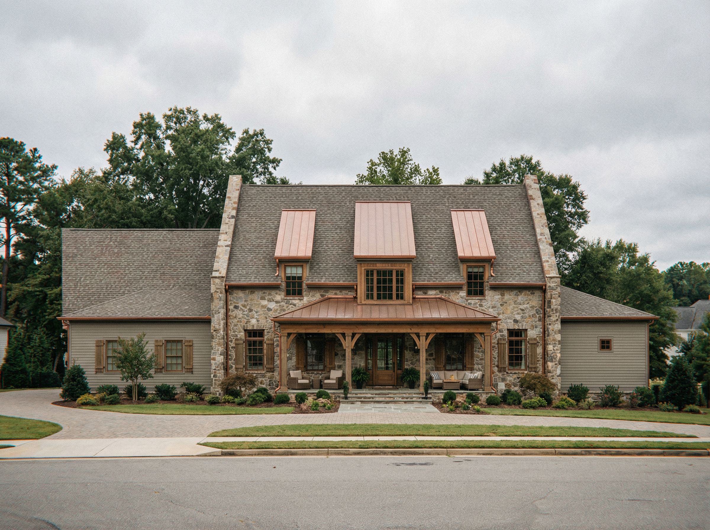 PromptKeep to original sketch. Render this house with stone front facade. Sloping stone parapet walls. No chimney. Contemporary siding on side walls. Copper metal roof accents. Copper gutters and downspouts. Wood trim accents. Inviting large front porch. Set in suburban neighborhood. Connect driveway and walkway to main road.