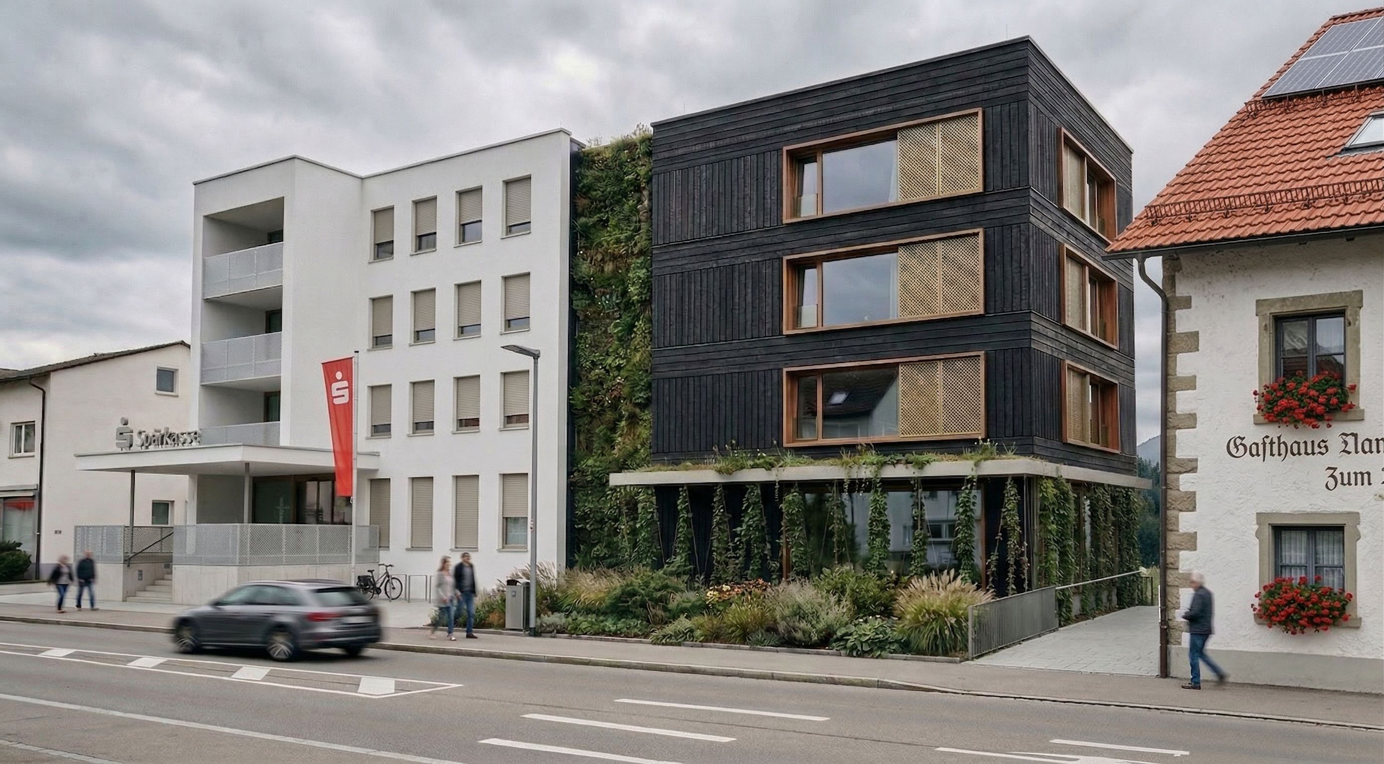 PromptErstelle eine hochwertige Architekturvisualisierung. Behalte dabei unbedingt die Geometrie und Perspektive aus dem importierten Bild bei. ergänze im rechten Bereich den Anschnitt eines Gebäudes auf Basis der beigefügten Referenz. Erhalte jedoch unbedingt die Einfahrt in den Hinterhof. Man sieht nur den Anschnitt des Gebäudes. Ergänze im linken Gebäude (Sparkasse) die Fenster in der Fassade), keep exact camera angle