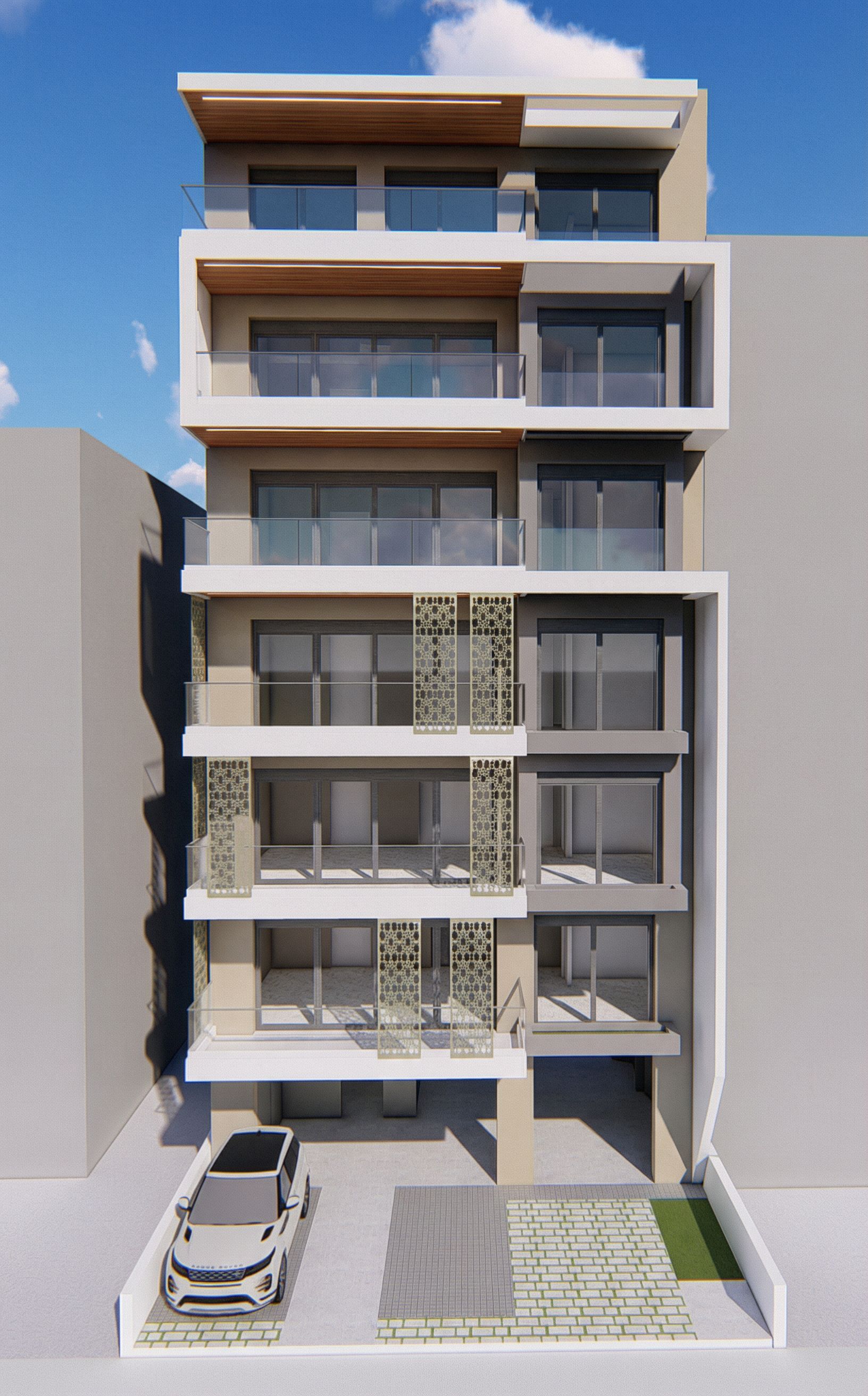 PromptPhoto of a modern apartment building featuring sleek lines and contemporary balconies. Emphasize , expansive glass windows, and wooden tops of balcony accents. Capture natural sunlight enhancing the architectural details, with soft shadows cast by the balconies. Basic color ral 7006 and some beige details with white balconies. Dont change the building. No trees .Do light grey the right and left box, keep exact camera angle