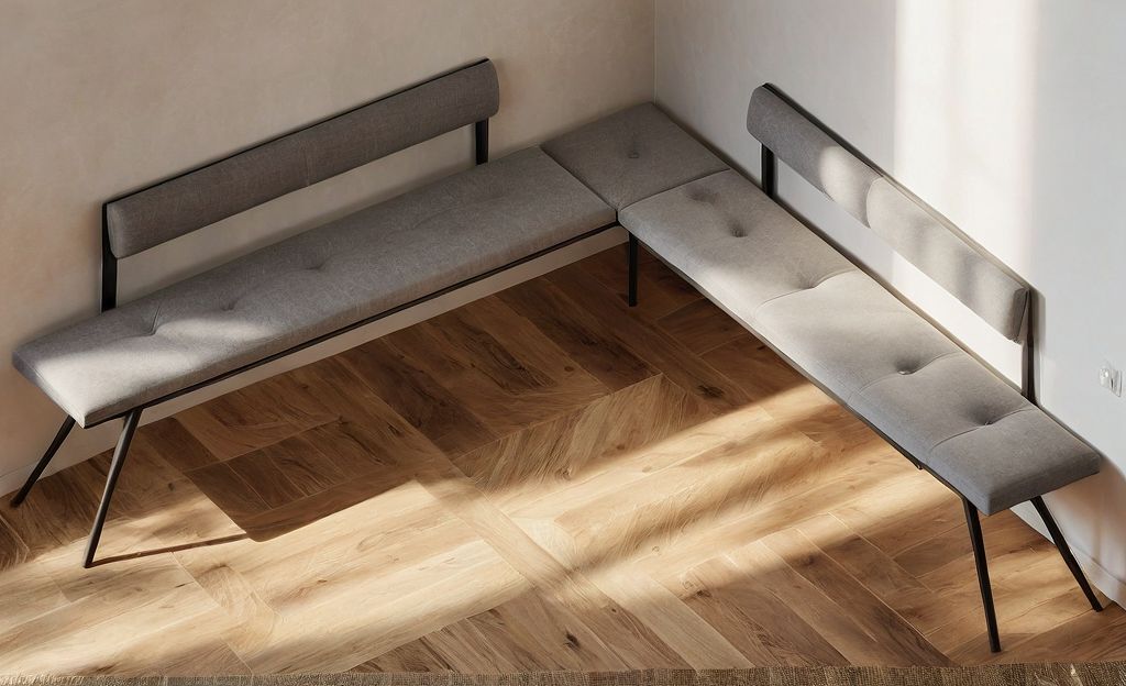 Promptrenders a fabric corner bench leaning against the wall at an angle greater than 90 degrees
