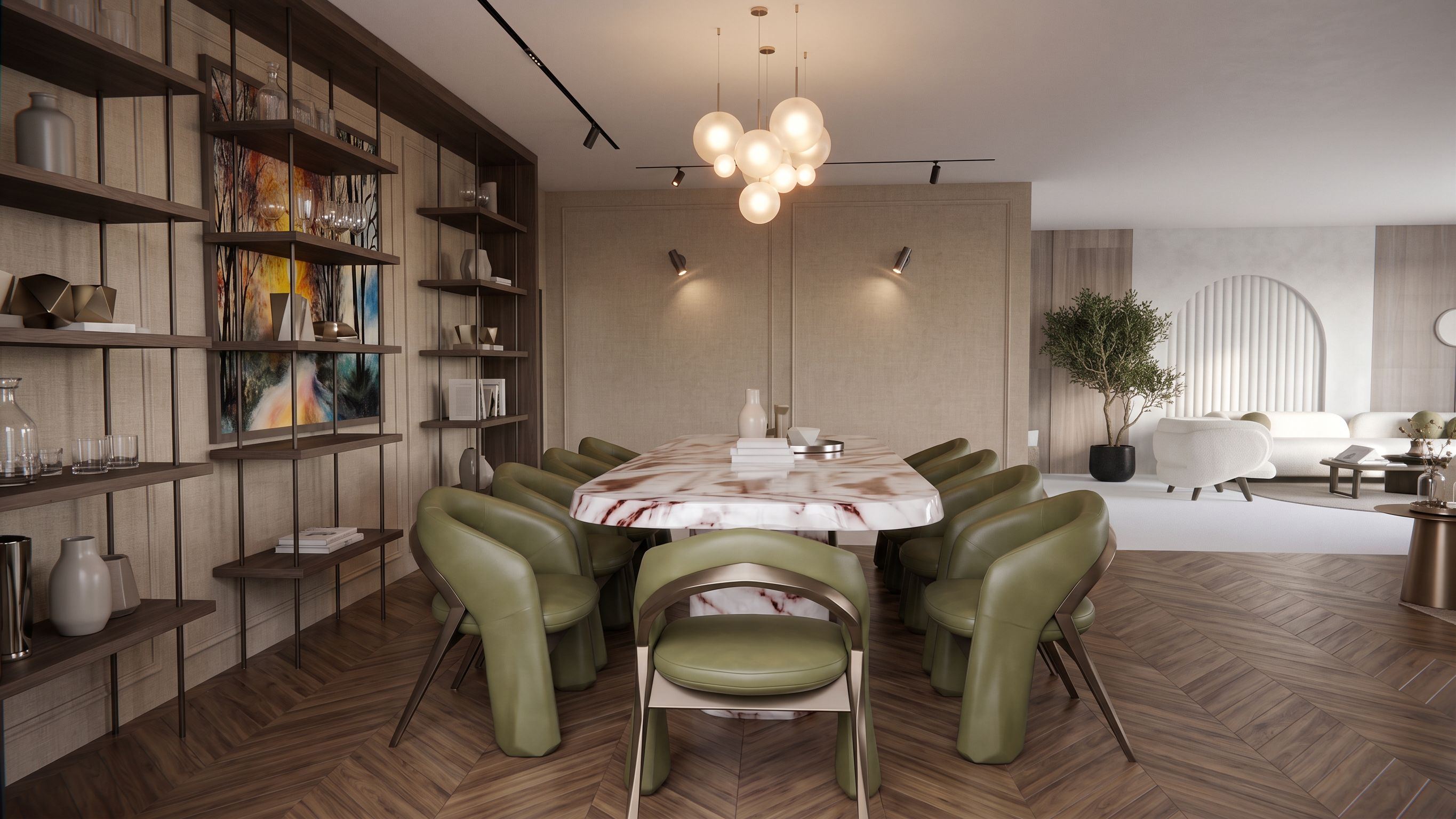 PromptUltra-realistic modern dining room, soft contemporary luxury style, warm neutral palette with earthy accents. Dining table with thick slab top in polished white marble featuring strong red/burgundy veining, slightly rounded edges, supported by sculptural marble legs. Dining chairs with curved backrests, upholstered in smooth olive green leather, matte finish, with dark bronze/brushed metal frames. Floor finished in natural wood parquet in herringbone pattern, medium walnut tone with subtle matte reflection. Back wall with textured fabric or micro-textured wallpaper in warm beige tone, framed with minimal wall moldings. Floating shelves in dark stained wood with slim black metal supports, styled with glassware, ceramic vases, and minimal decorative objects. Large central mirror with thin metallic frame reflecting the chandelier and adding depth to the space. Lighting: Statement chandelier with multiple frosted glass globe bulbs, warm 2700K–3000K, soft diffused glow. Ceiling track lights in matte black with adjustable spotlights, subtle accent lighting. Natural daylight entering from large window with sheer white curtains, soft and diffused, balanced exposure. Soft indirect ambient lighting, no harsh shadows, realistic light falloff. 🪴 DECOR & REALISM DETAILS (very important) Dining table styling: Minimal centerpiece with ceramic vase, small sculptural object, stacked books, and tray. Add subtle imperfections: fingerprints on marble gloss, micro scratches, fabric creases on chairs. Shelves styling: Mix of transparent glassware, matte ceramics, and metallic accents. Add slight randomness (not perfectly aligned). Extra realism: Soft shadows under chairs and table Accurate reflections in mirror and marble Ambient occlusion in corners Slight dust and natural variation in materials 🎥 CAMERA & RENDER SETTINGS Eye-level shot, centered composition Lens: 35mm for natural perspective Photorealistic, global illumination, ray tracing High dynamic range, soft contrast 8K resolution, ultra-detailed textures. “same materials, same lighting setup, same scene, different camera angles only” Then change angles like: side angle from chair level close-up on marble table perspective focusing on shelves shot through foreground (cinematic depth) Update: the dining table is semi circular from both sides + this is not the chairs in the shot i want the same exact chairs + Put 2 spots in the front wall like reference image 2. UPDATE I NEED SAME SHOT ITS PERFECT JUST PUT BACK WHAT'S ON THE LEFT SIDE OF THE SHOT (BUFFET + THE SHELVES ON THE LEFT), keep exact camera angle