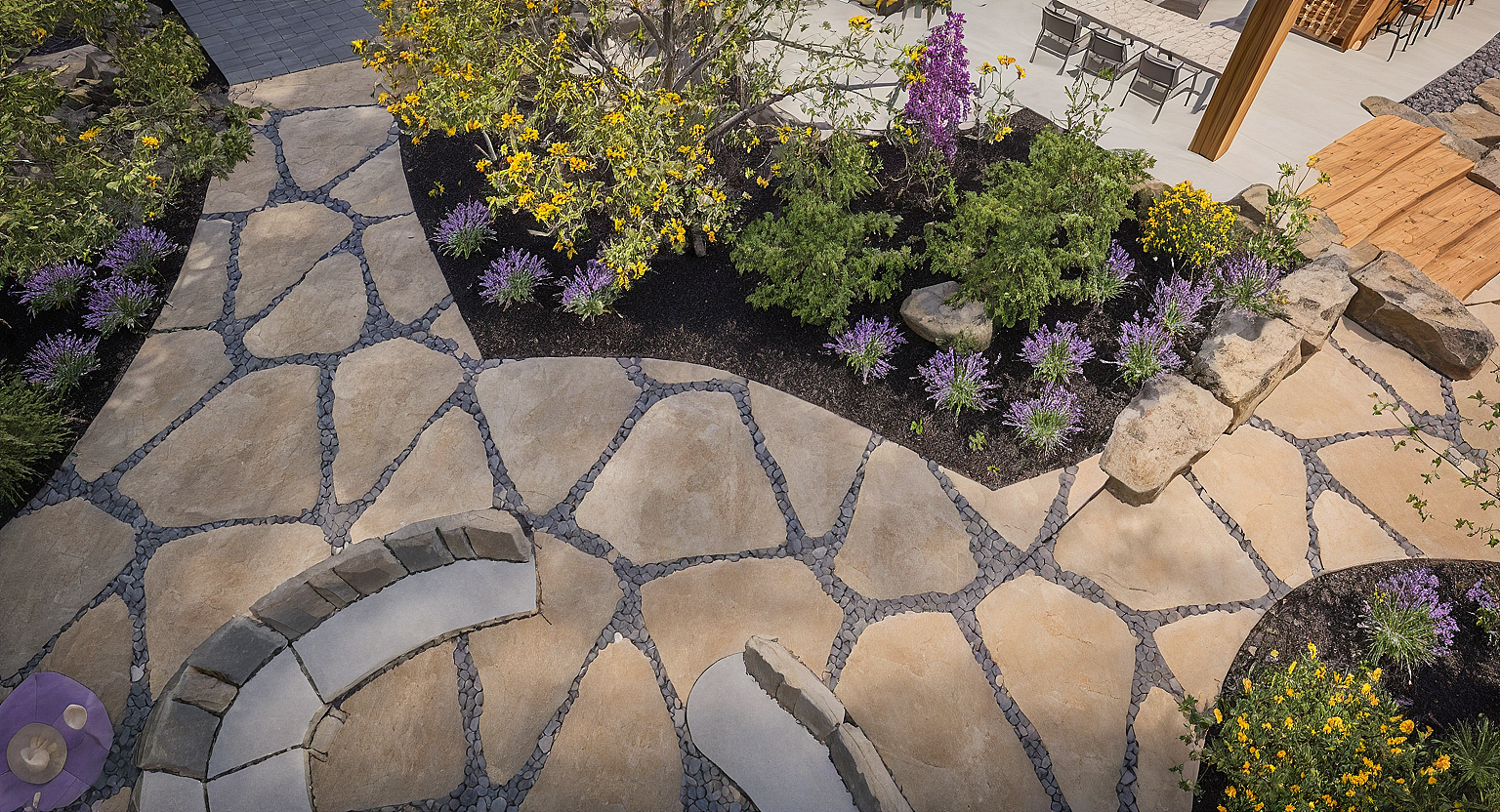 Promptteak siding, flagstone patio, lilac, birch trees, black-eyed susan, juniper, asters, landscaping
