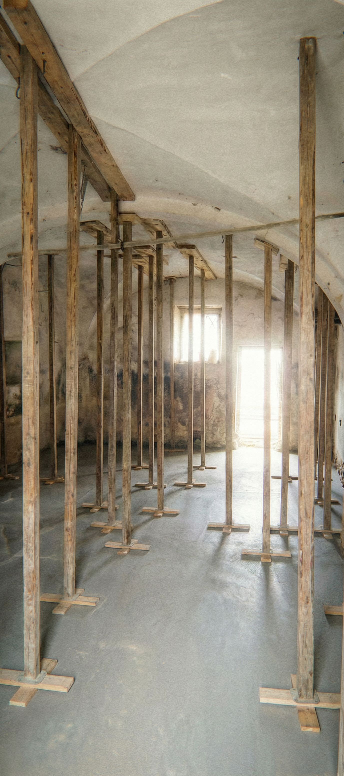 PromptInsert wooden pillars fixed to the ground with wooden planks at the blue marks., keep exact camera angle