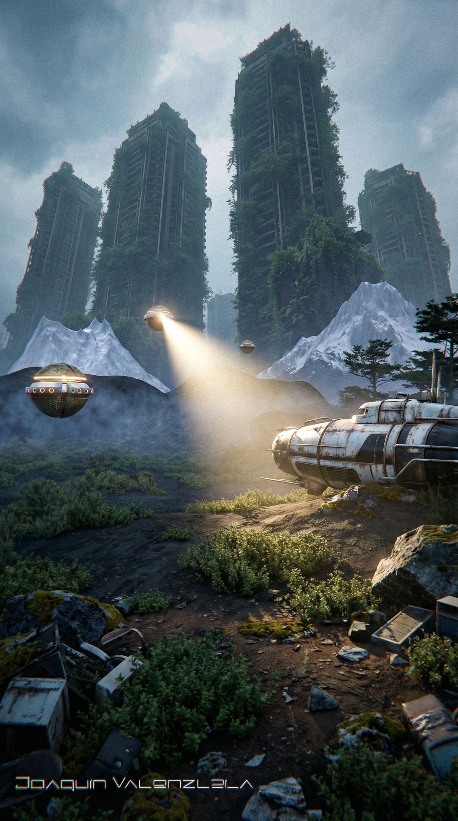 Promptpon una ciudad de edificios apocalípticos de grandísimos rascacielos al fondo detrás de las montañas, como en las imágenes de referencia. cambia el estilo de la nave grande de la derecha por un estilo retro futurista super moderno con tonos entre acero, blanco con toques de óxido y detalles en negro todo ligeramente envejecido. añade algunos puntos de suciedad y algo de desorden por el suelo. haz que la nave pequeña del centro emita una luz que ilumine y enfoque a la nave grande de la derecha., keep exact camera angle