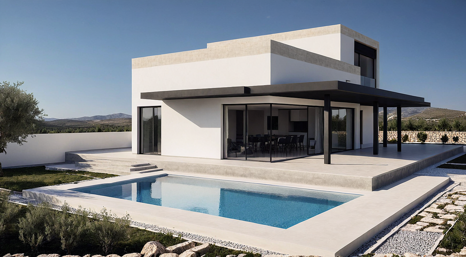 Prompt free standing single family house in greece, minimalistic aproach. exterior rendering.swimming pool in the front. Blue sky on top. Terrace out of screed. A few olive trees in the garden around the terace.Glazing with black framing. Pillars of pergols in black. The ceiling plates are made out of visible concrete. The exterior walls are white.