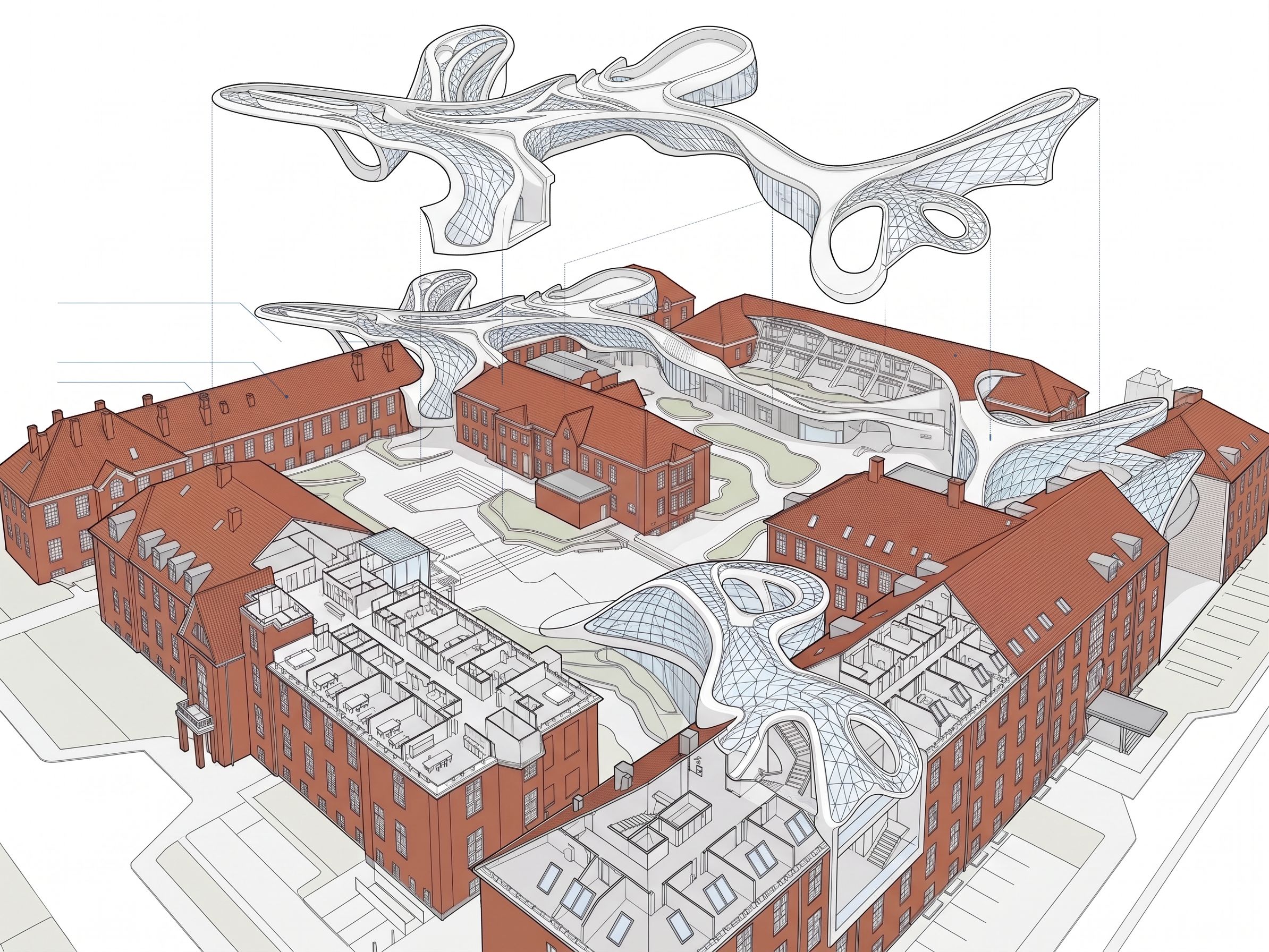 PromptCreate a 5-level separated exploded isometric view ideogram based "perfectly" on this image in detail. The plans for the first 4 levels are similar and contains only one floor; the roof will be identical to the white glass roofs shown in the figure., keep exact camera angle