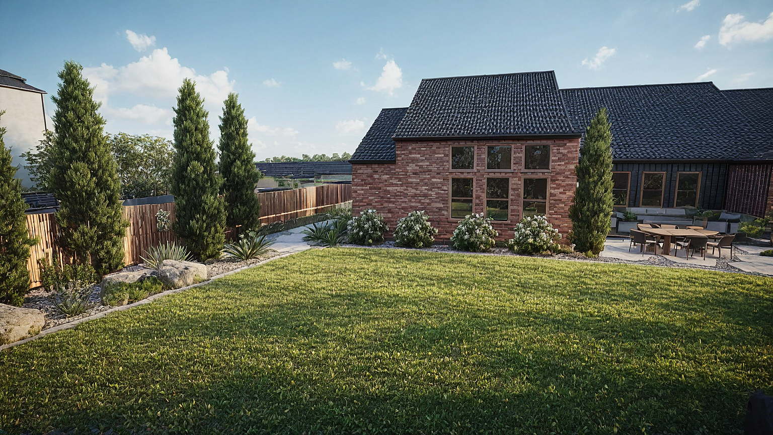 photo realistic, brick house, wood fence