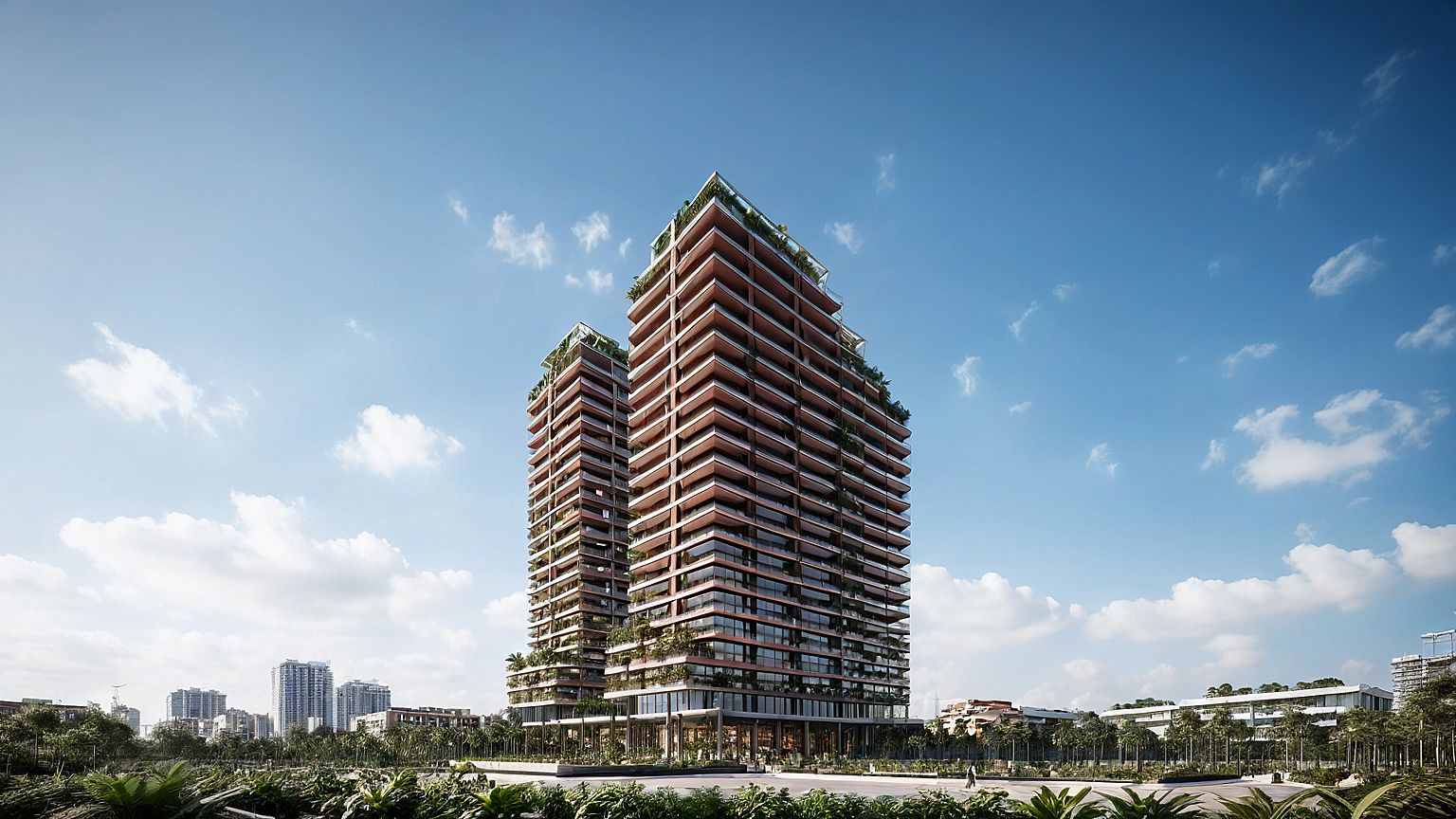 Prompt"High-rise building with a tropical bioclimatic design — structure elevated on pillars above a large podium clad in textured terracotta panels. Upper levels feature a grid façade with deep vertical and horizontal fins, modular balconies, and integrated greenery. The tower showcases natural ventilation strategies, with planters and vegetation embedded into the façade. Mid-section includes an open-air sky garden with large support columns and hanging vegetation. Surrounding context: dense urban area with adjacent glass and concrete buildings. Lighting is natural daylight with soft shadows. Emphasize realistic materials (terracotta cladding, concrete, glass), vertical garden elements, and a warm, sustainable aesthetic. Camera angle from below looking upward, dramatic perspective emphasizing height and texture."