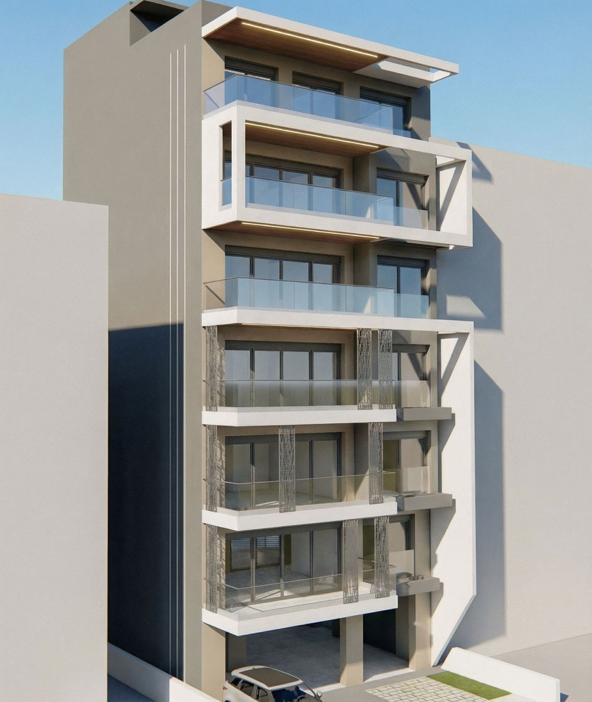 PromptPhoto of a modern apartment building featuring sleek lines and contemporary balconies. Emphasize , expansive glass windows, and wooden tops of balcony accents. Capture natural sunlight enhancing the architectural details, with soft shadows cast by the balconies. Basic color ral 7006 and some beige details with white balconies. Dont change the building. No trees .Do light grey the right and left box. white Grammical Light in the wooden balcony. No spot light, keep exact camera angle