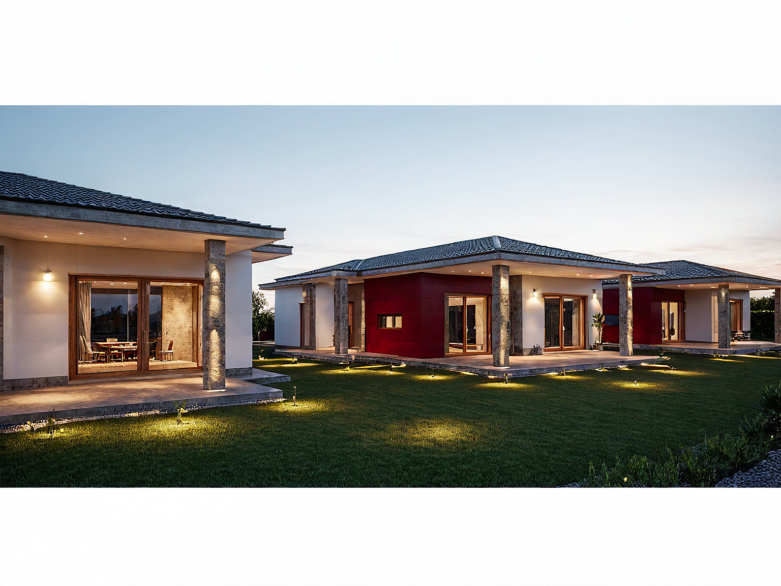 Promptstay true to the building form, sunset time, modern villa, wood, stone and gross concrete materials, columns white paint, facade and lawn lighting, plants and grass in the garden, roof tiles red color, garden furniture, people in the garden, let there be separate plants between the houses