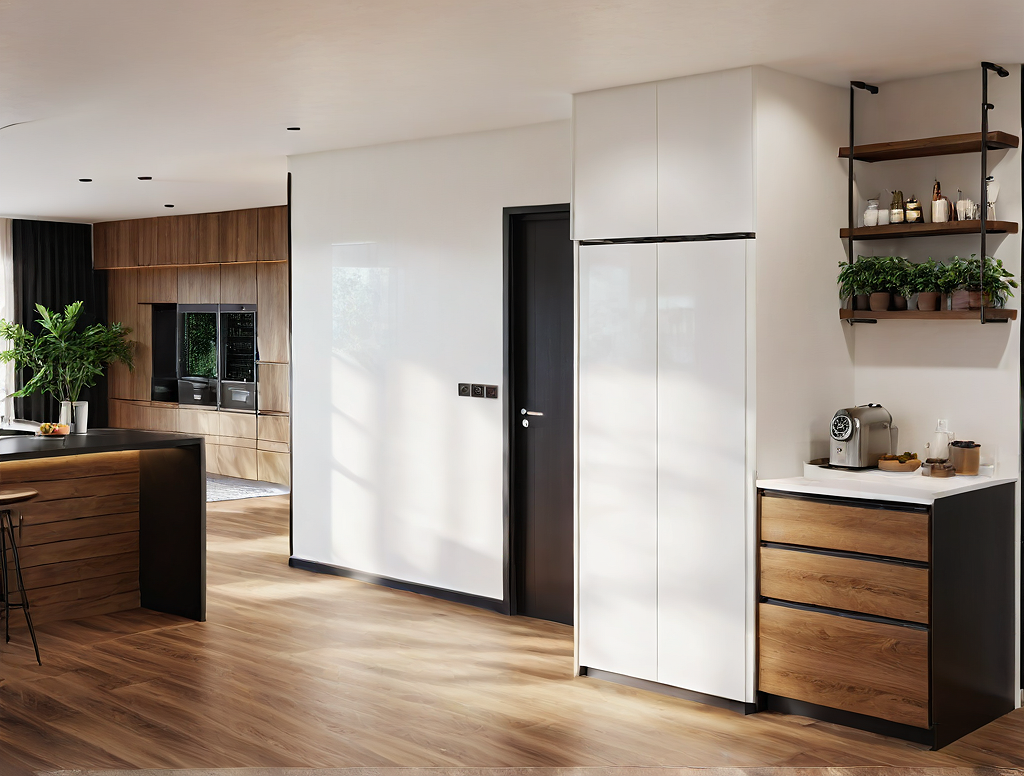 PromptKitchen with coffee corner, coffee machine, white melamine furniture, American frigurific furniture, decoration with potted plants, paintings, books and clocks, walnut wood and black iron shelves, oak floating floors, entrance door walls and white ceiling.