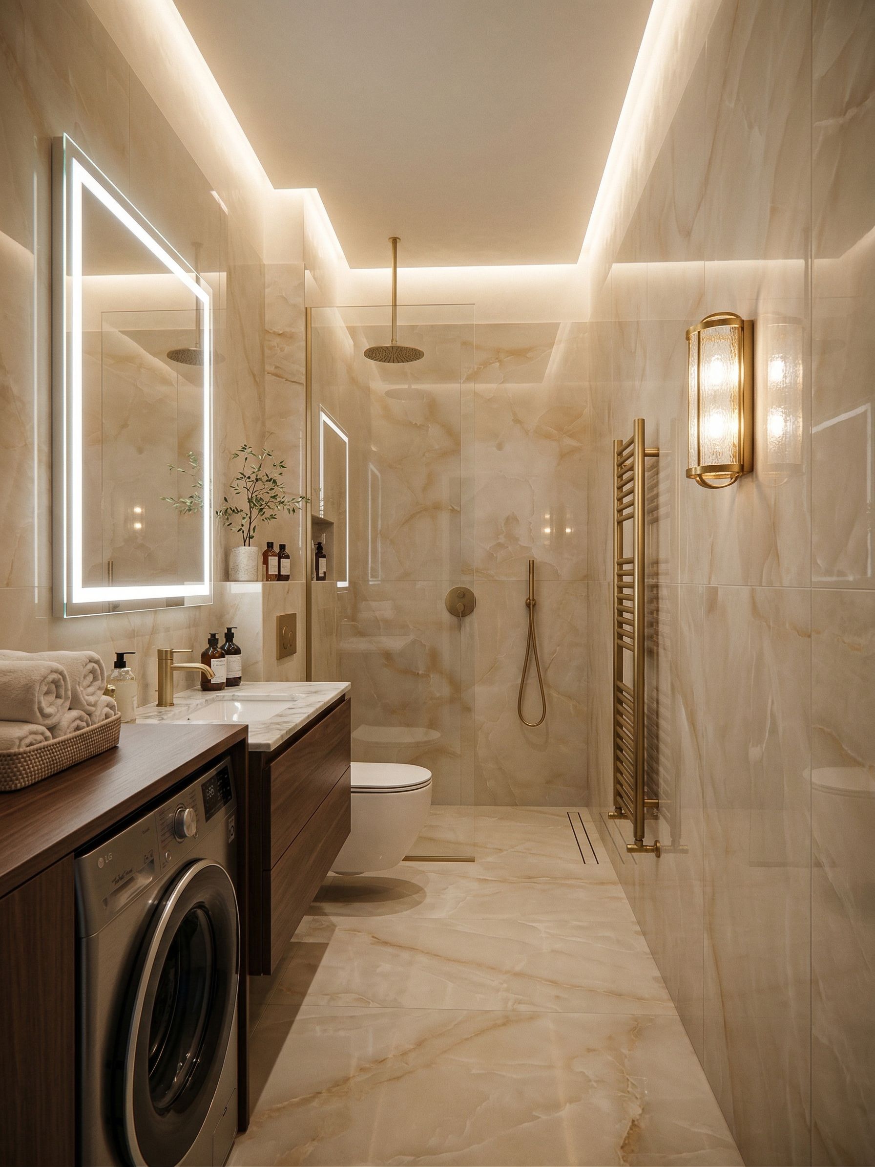 Promptcreate a beautiful bathroom, dont create opening. From the left side from front to back there are a washmachine, a sink, toilet, and shower, THE MIRROR with led lights, , keep exact camera angle