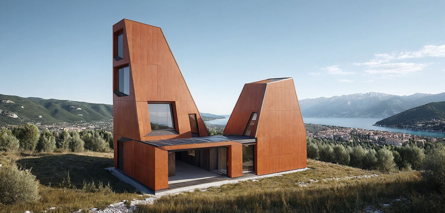 Promptbuilding structure is x-lam panel with load bearing wall exterior facade is covered with cor-ten alluminium that has bronze orange brown color , One big tower and one small tower. Two towers all have windows which all are bow windows with simple design, on the first floor there is living room with big window. There is terrace on the second floor between two towers . top of the tower have a skylight window with solar panel . Building is located in Verona Malcesine, on the little hill in the middle of the trees and grasses