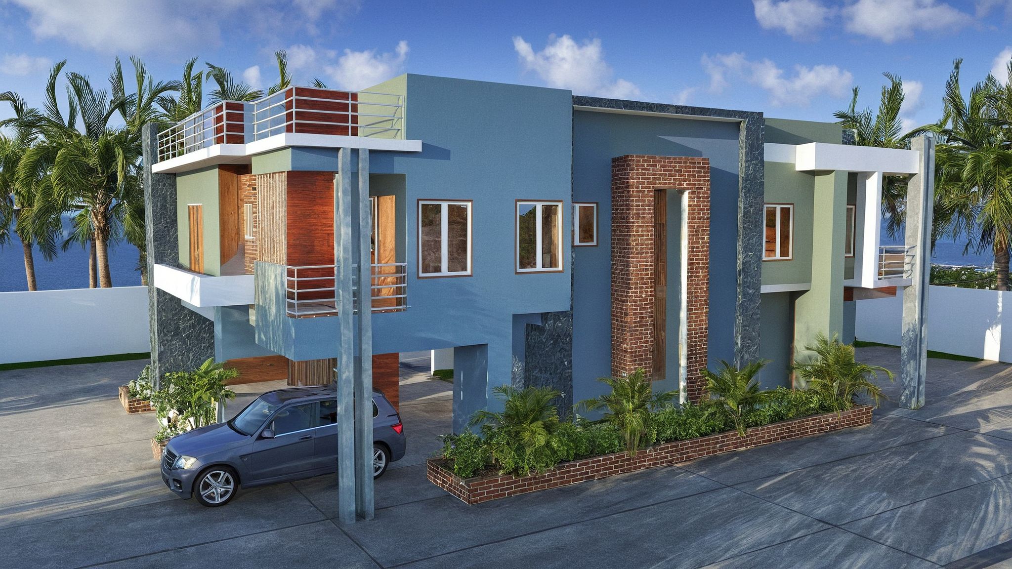 Photo of a contemporary residential building with a mix of brick and painted green concrete. Featuring large, modern windows, horizontal balcony railings, and natural stone accents. Set in an urban context with palm trees and adjacent structures visible. Bright midday sunlight casts dynamic shadows on the façade, enhancing texture contrasts. Framed from a slightly elevated angle, highlighting the two-story design and landscaped surroundings. A wide-angle lens provides depth, capturing the full scope of the architecture and outdoor space.