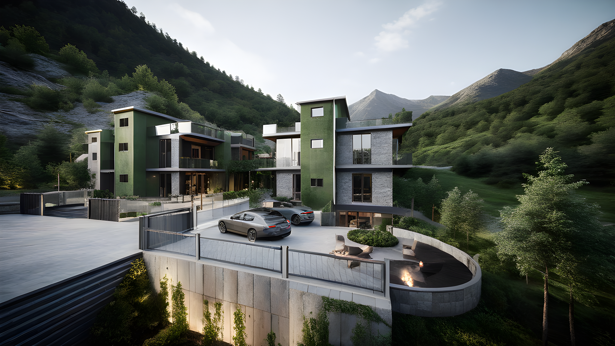 Promptlandscape ,mountains ,stone ,grey, green elements in design ,original version ,same design , make render better only,green walls ,grey walls, left side wall green