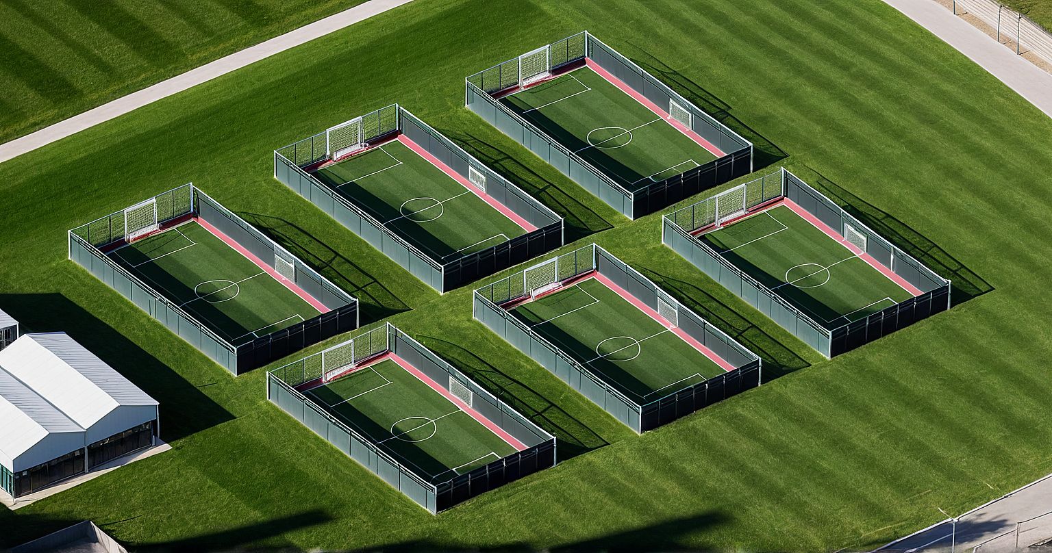 Fotografía de un moderno complejo deportivo con canchas de futbol y otros deportes. La luz natural realza los vibrantes colores, proyectando sombras suaves. Capturada desde una perspectiva picada con un objetivo gran angular.