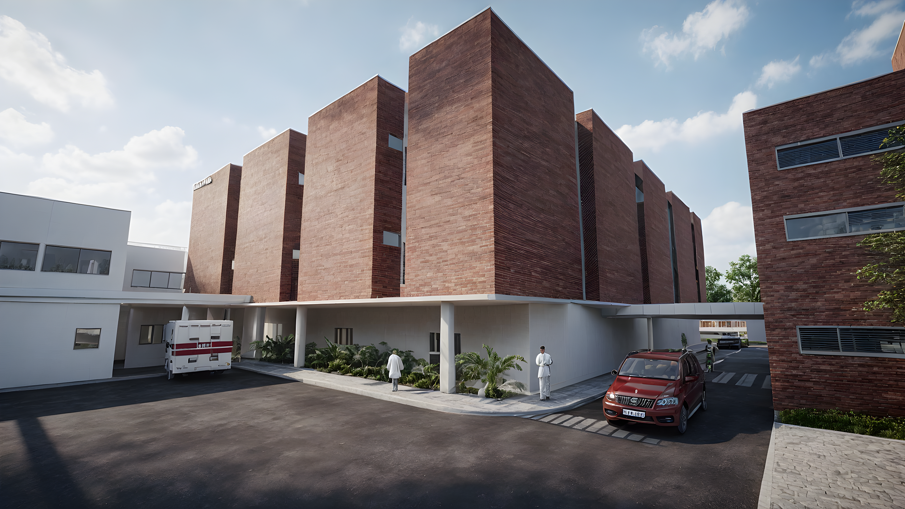 precise brick facade hospital exterior render architecture studio