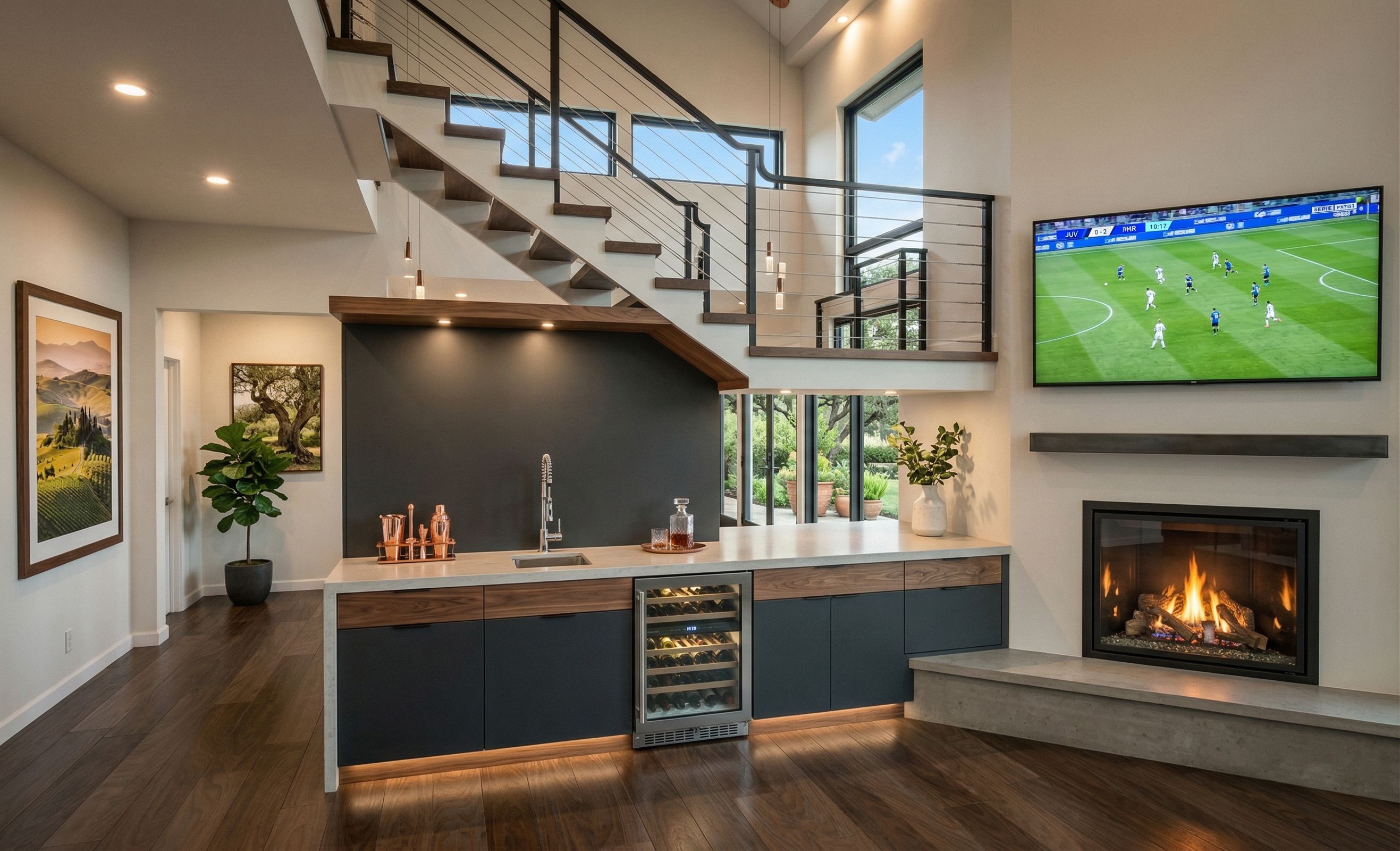 make photorealistic rendering from this image add wet bar under the stairs next to fireplace as indicated by red area design it so the fireplace and wet bar are connected fireplace is direct vent gas fireplace, show fireplace on burning, fireplace wall is drywall TV above the fireplace is playing Italian soccer game change yellow picture frame with Italian countryside scene skies trough the upper window green scenery through lower glass door and windows lights on in the room add light fixtures where appropriate , keep exact camera angle