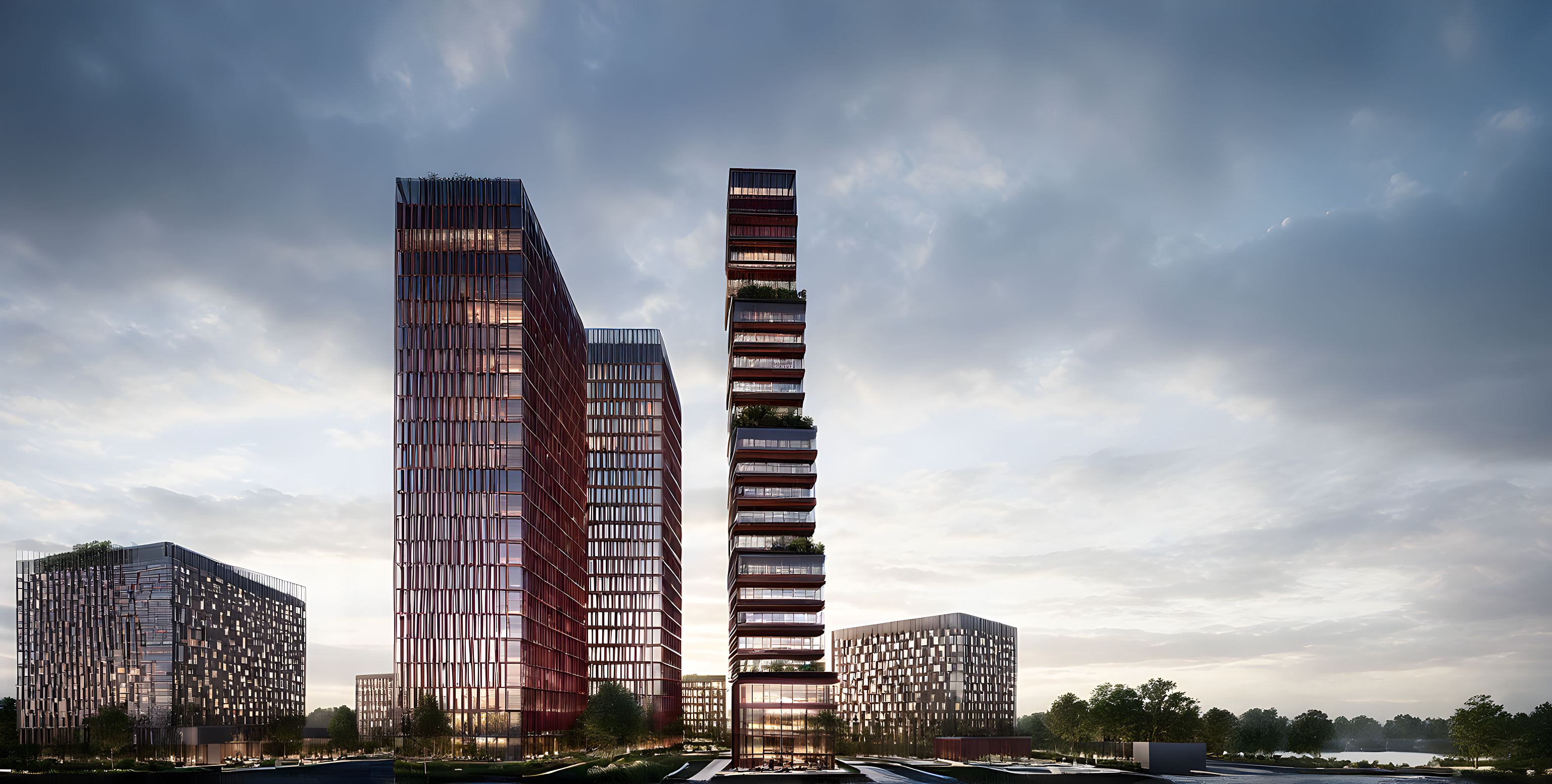 PromptCreate a conceptual rendering of a slender, monolithic skyscraper with a sculptural, staggered massing that gradually shifts as it rises. The facade features a rich reddish-brown cladding with a dense grid of square windows, giving the tower a pixelated yet elegant texture. The base of the building is elevated on angled pilotis, creating a transparent ground level that connects to a reflecting pond. Surround the tower with soft mist, a reflective water surface, and subtle natural elements like trees and a swan to emphasize contrast between the built form and the organic context. Use a moody sky with dramatic light filtering through the clouds to enhance the architectural presence and evoke a cinematic atmosphere.