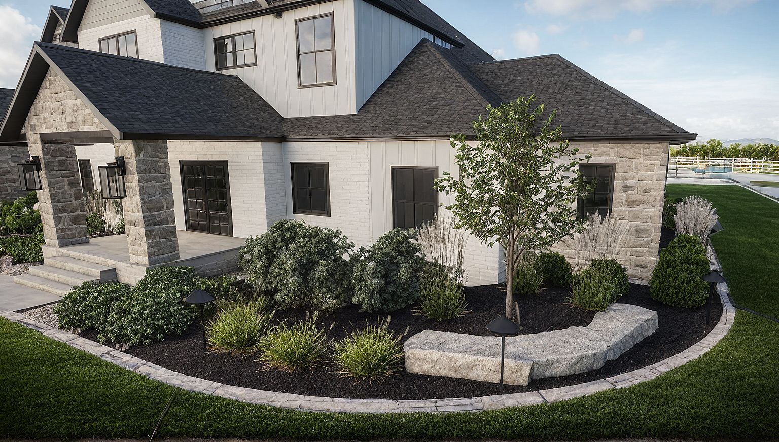 enhance, mulch, gray rock, concrete walkway, lawn, boxwoods