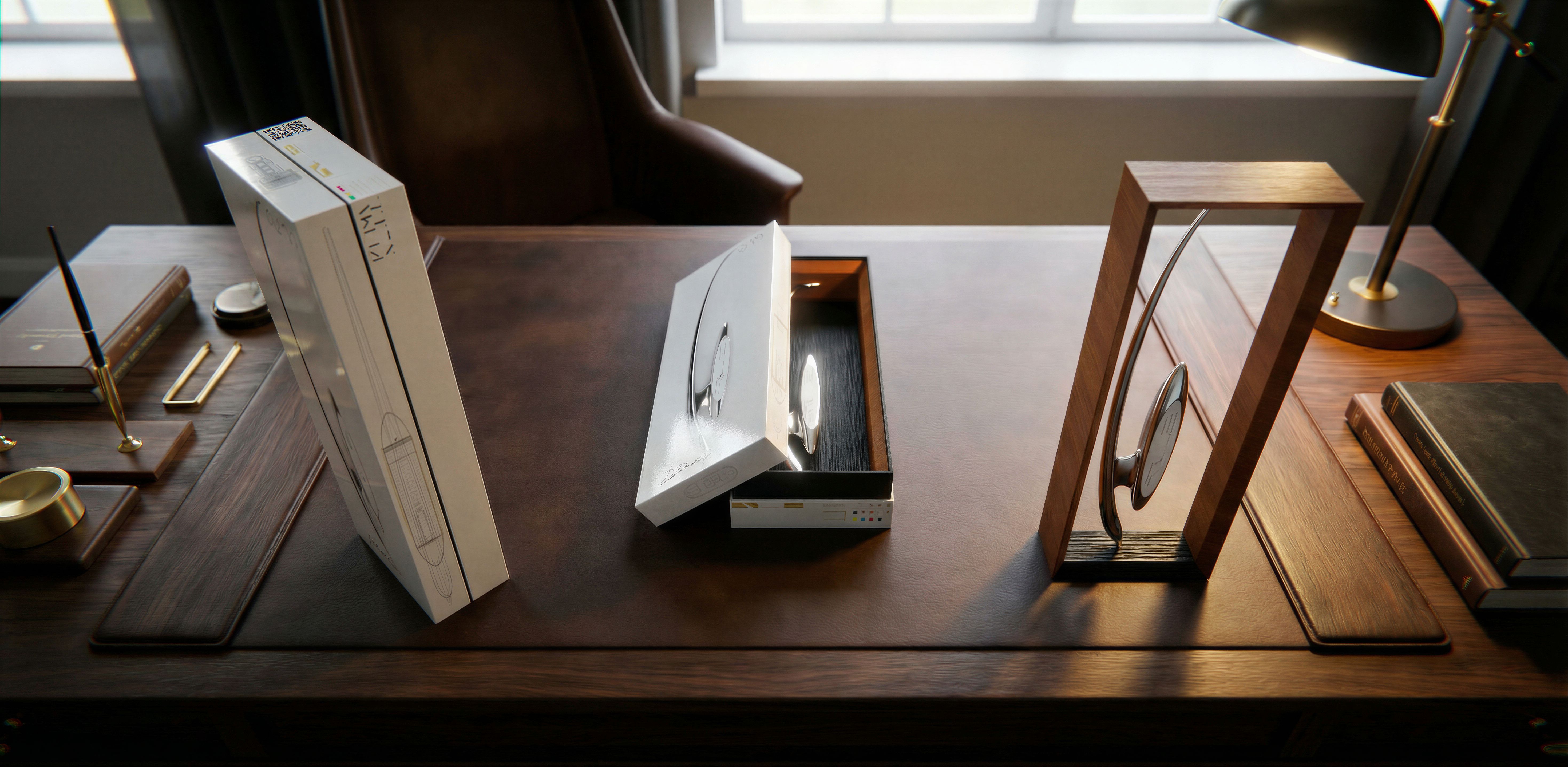 CREATE A HIGHLY REALISTIC IMAGE; MAKE THE WHITE FINISH WITH THE PRINTS SLIGHTLY GLOSSY; THE WOOD OF THE FRAME IS SAPELE WOOD; THE GRAY OF THE FRAME IS A BLACK FINISH WITH A WOOD-LIKE FINISH; THE BOTTOM OF THE BOX ON THE FLOOR, UNDER THE CHROME PEN, IS A BLACK FINISH WITH A WOOD-LIKE FINISH. PLACE THESE PEN BOXES ON A HIGHLY DESIGNED DESK., keep exact camera angle