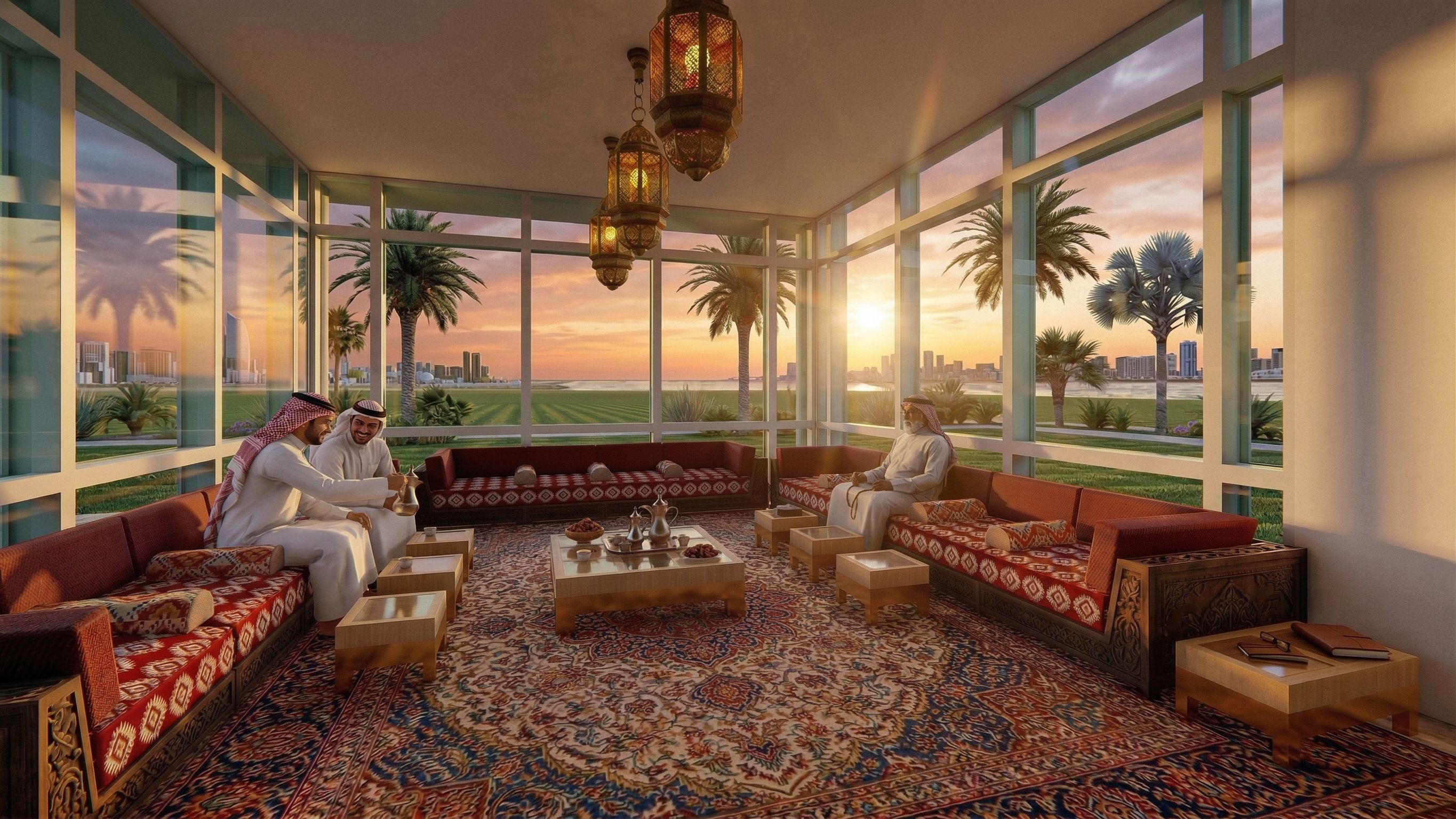 add men in the guest room from the Bahrain, keep exact camera angle