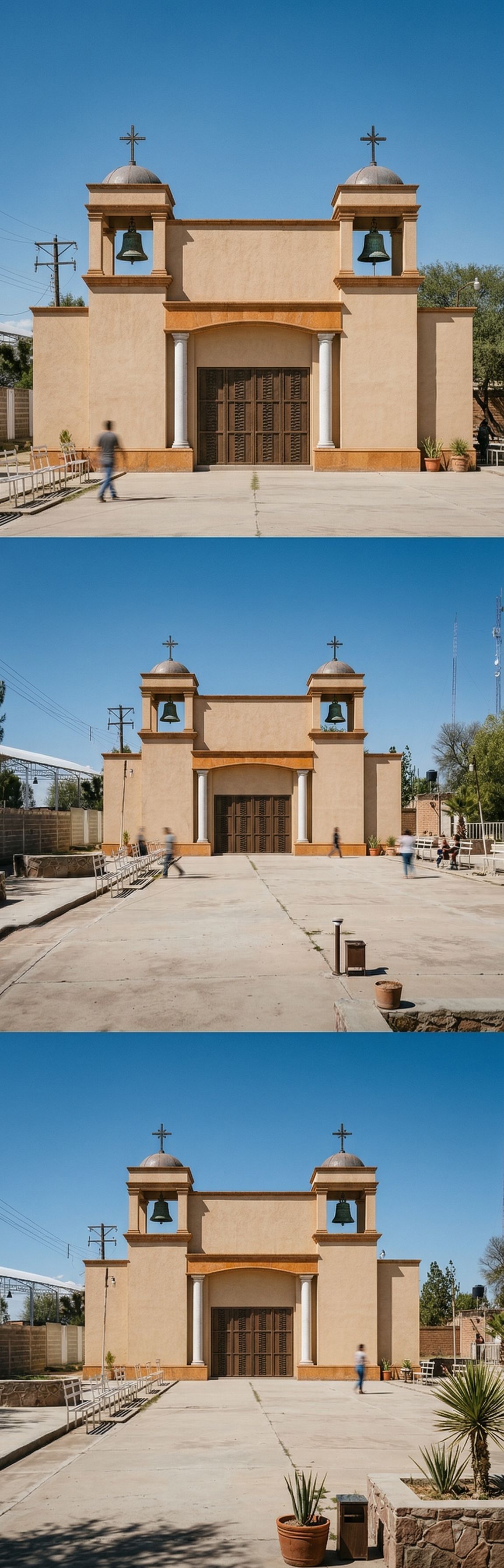 PromptPhoto of the facade of a traditional church with prominent bell towers topped with domes, made with warm beige stucco and metal gates as in the reference image, the moldings are made of quarry stone, the columns are white, place the original image in the center of the reference image, respecting the surrounding environment where it is located, the design of the original image is respected