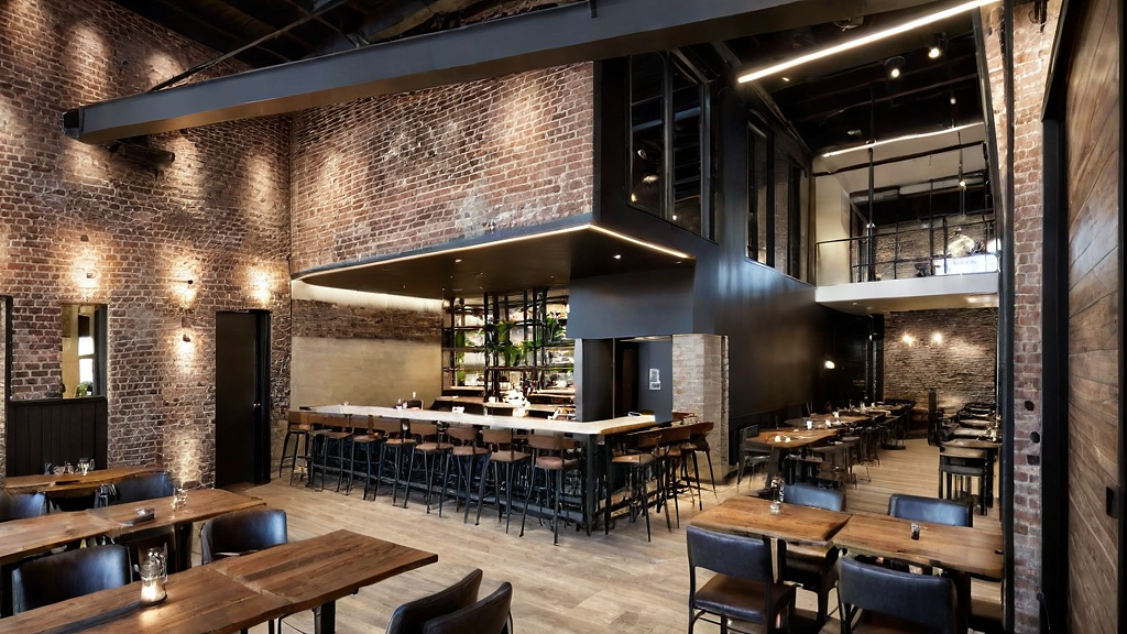 PromptInterior seating area of a Jamaican fine dining restaurant with a modern industrial style. The space features existing weathered brick walls and neutral color on the new wall. Combination a mix of wooden and metal structural frames, and wood flooring. Industrial style light sconces provide warm ambient lighting. The furniture includes dark wood tables and plush seating with a modern yet rustic aesthetic, creating a sophisticated bright atmosphere.