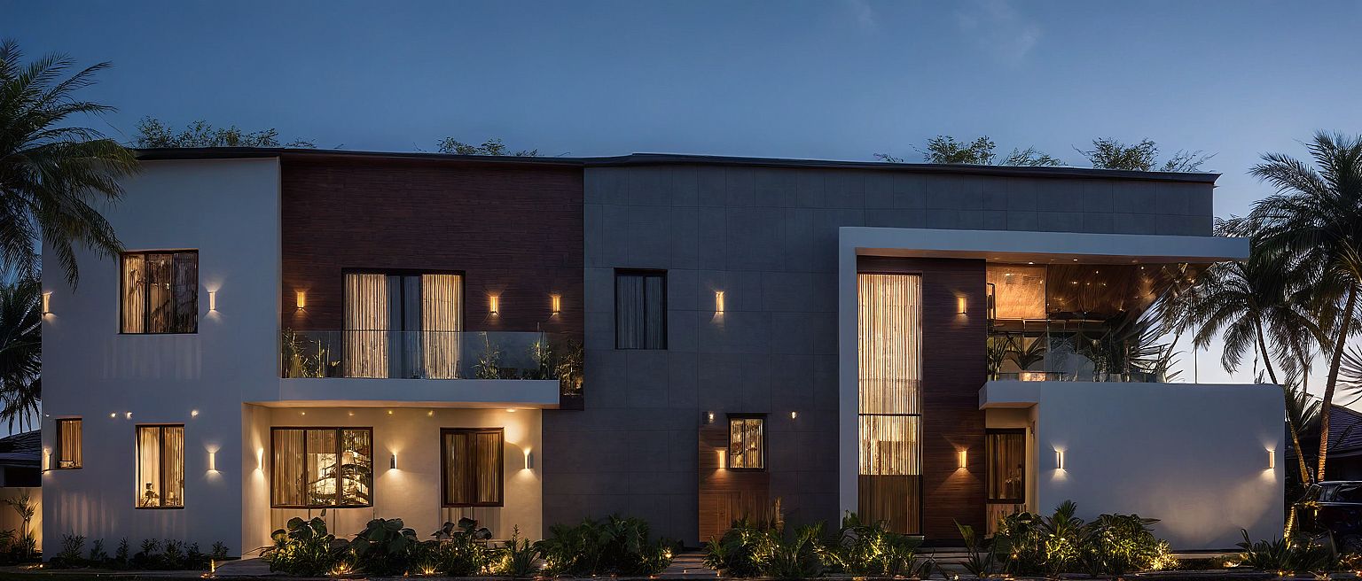 PromptPhoto of a modern residential house with a combination of textured surfaces and smooth finishes, featuring large windows and a prominent entrance. Set against a tranquil suburban backdrop with palm trees, the building stands under twilight, casting soft shadows. The scene is illuminated by subtle artificial lights along the facade. Captured from a low angle with a wide lens to emphasize the structure's scale and surroundings, highlighting the harmonious blend of architecture and nature.