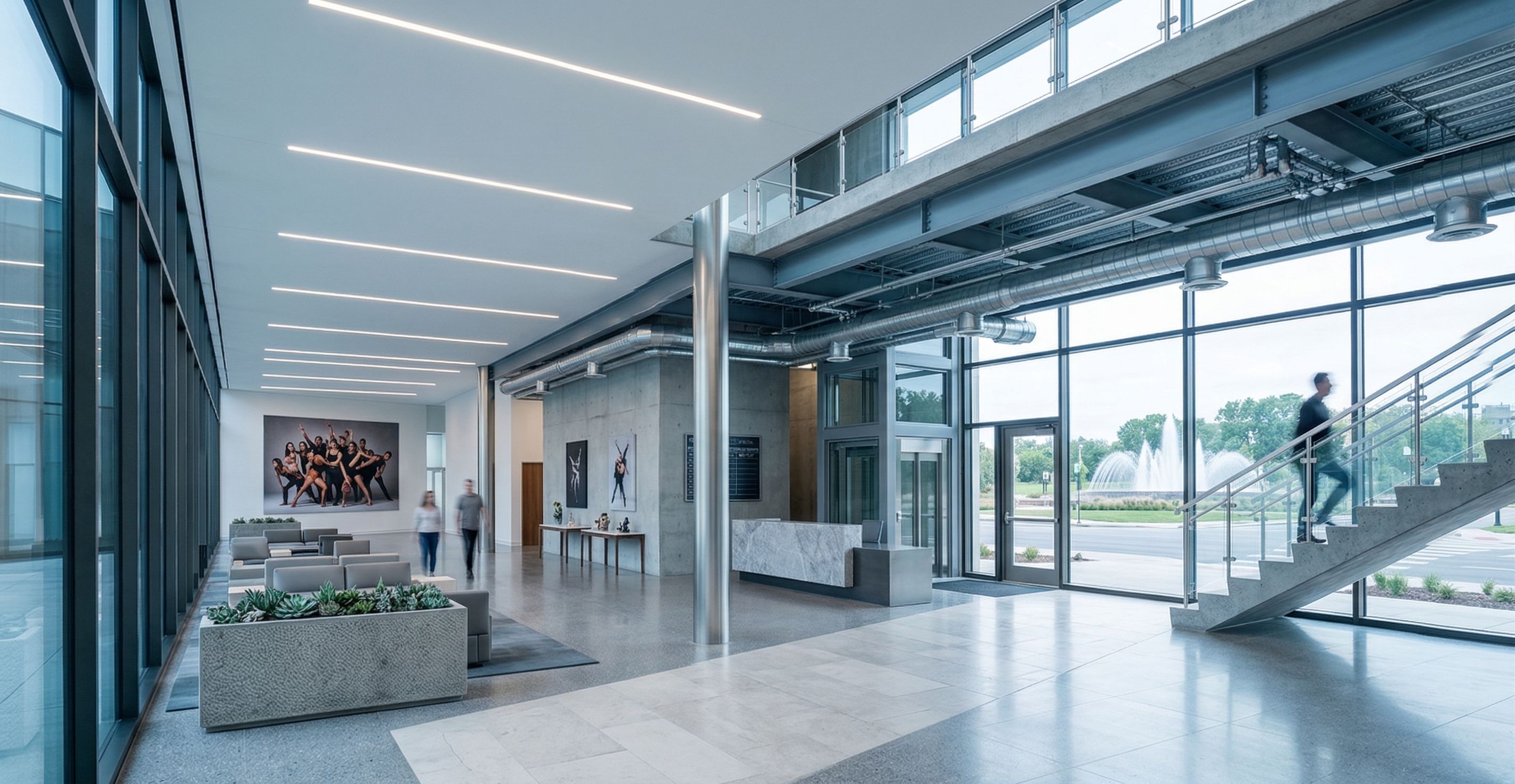 PromptKeep everything the same. Just add a circular steel column, a front door, limestone flooring in the entrance area, an elevator next to the entrance, and show the exposed steel beams and mechanical system. Showcase a portrait in the background. Use cool colors to create a pleasant entrance experience that conveys a modern community dance center feeling. Show an open landscape with a water fountain as a background view from the lobby, with a road intersection
