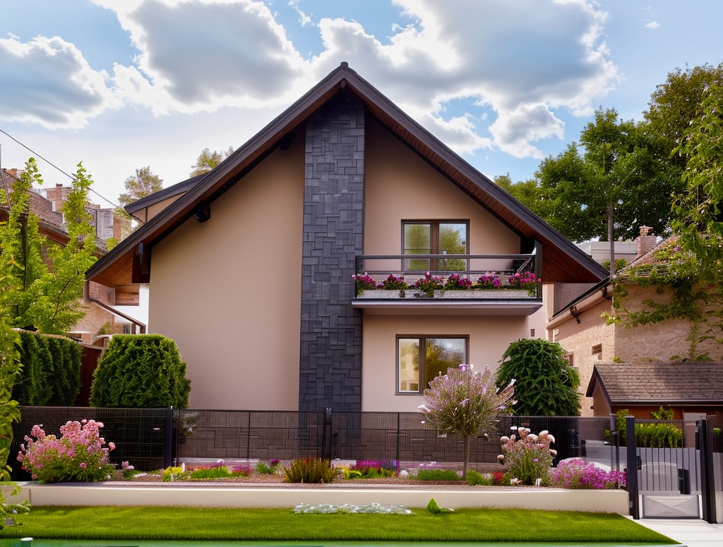 Promptblack roof, light brown window, light brown facade, new small trees and flowers in garden,