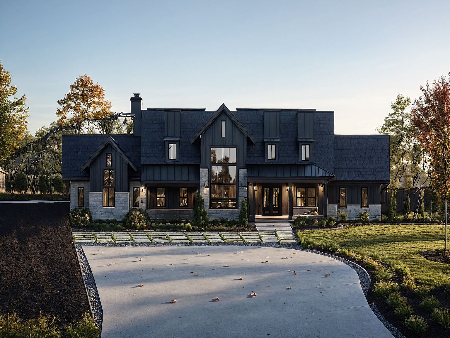 PromptA modern farmhouse in the mid-morning early fall time. Dark modern exterior finishes and colors. Side entry garage with concrete driveway.