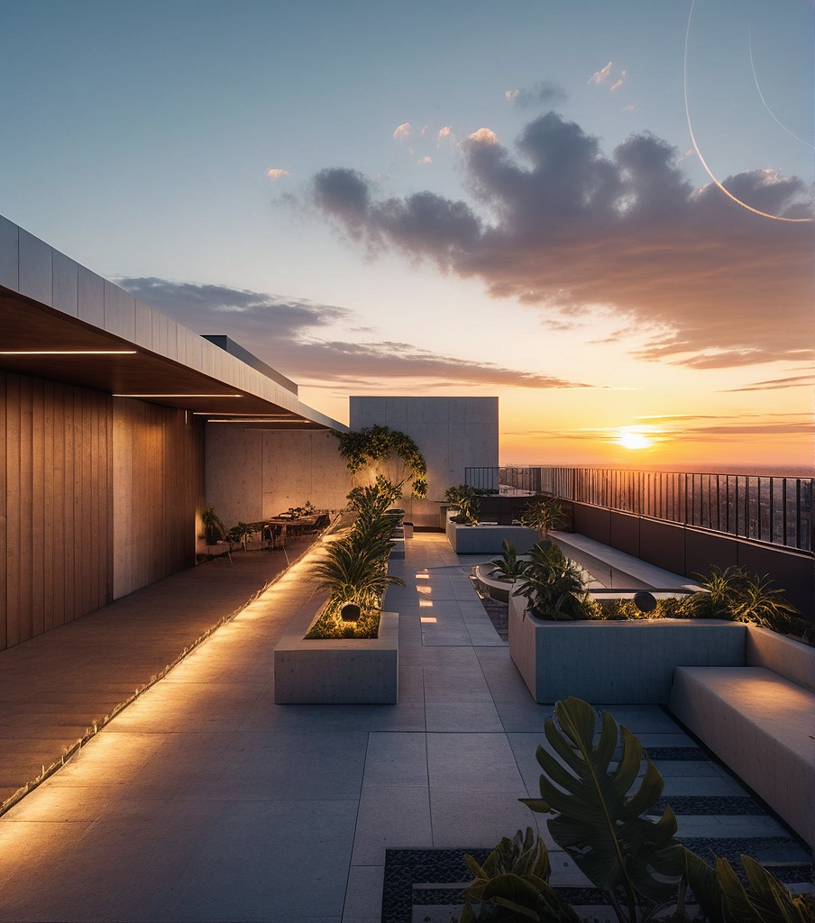 Promptmake this scene in a rooftop with a beautiful sunset, with a contemporary colors. Make the exact same scene.